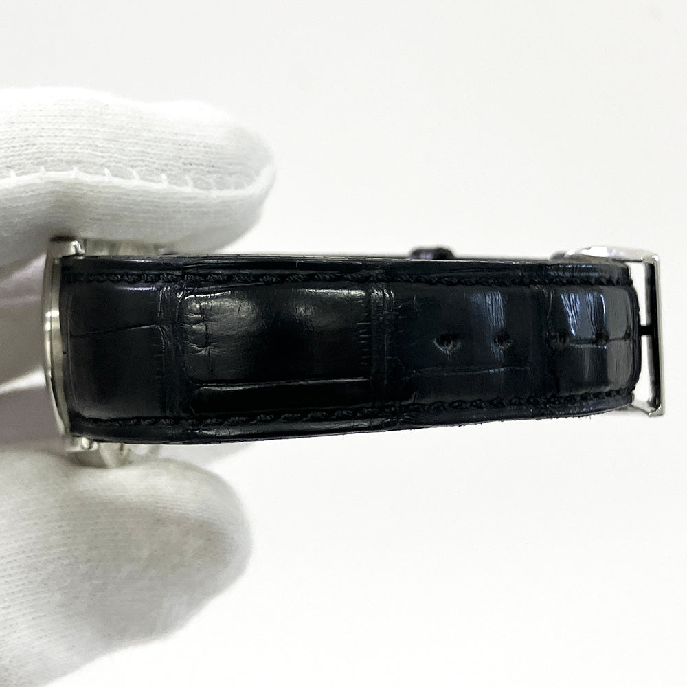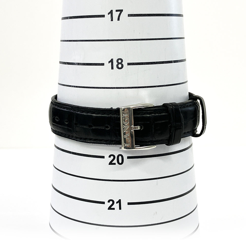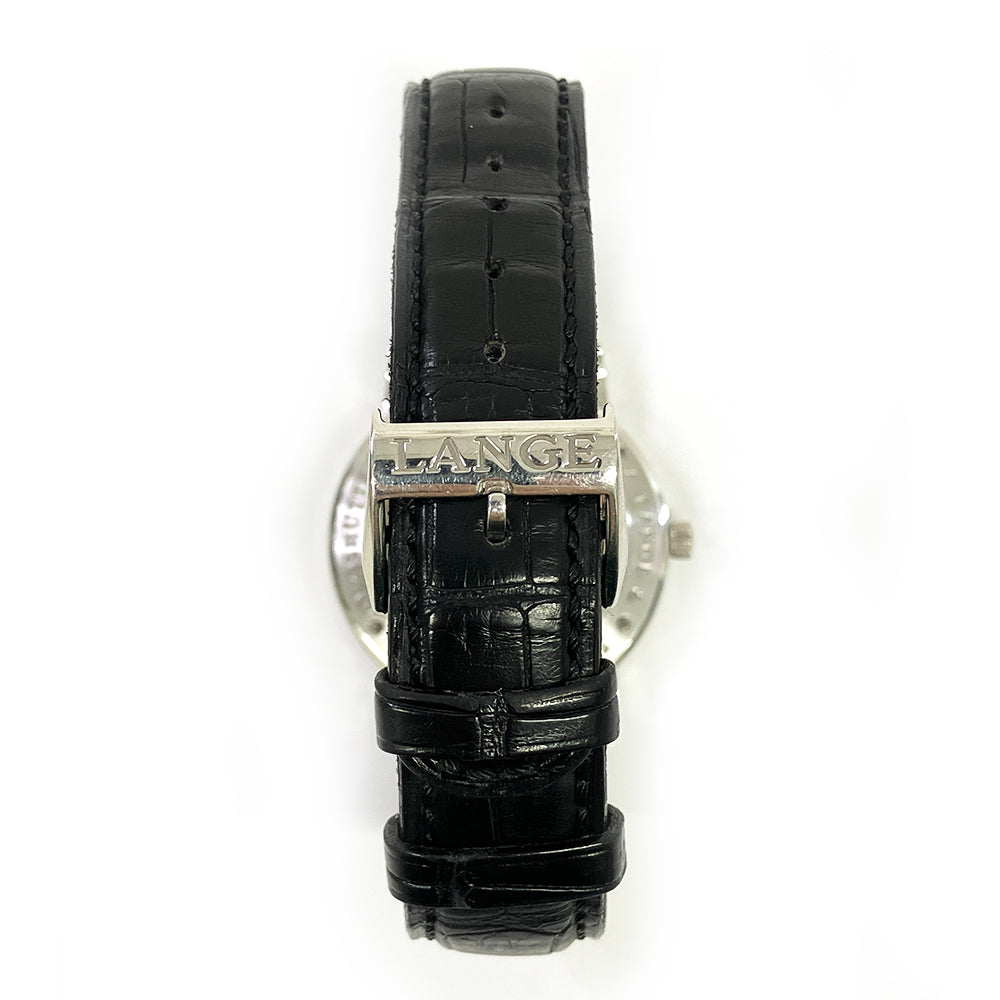 Platinum case with a black leather strap. Fixed platinum bezel. Silver-tone dial with blue hands and Arabic numeral hour markers. Minute markers around the outer rim. Dial Type: Analog. Hand wind movement. Scratch resistant sapphire crystal. Transparent see through case back. Round case shape, case size: 35.9mm. Buckle clasp. Functions: hour, minute, second.1815 Series. Casual watch style.