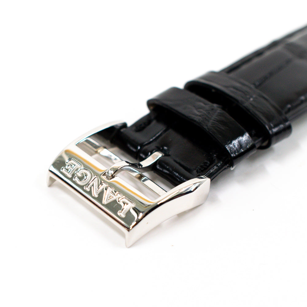 White platinum case with a black crocodile leather strap. Fluted platinum bezel. Silver dial with white alpha-style shape hands and Roman numeral hour markers. Dial Type: Analog. Date display at the 1 o'clock position. Two sub-dials displaying: small second and power reserve indicator. A. Lange & Sohne Calibre L901.2 Hand Wind movement, containing 53 Jewels, bitting at 21600 vph, and has a power reserve of approximately 72 hours. Scratch resistant sapphire crystal. Round case shape, case size: 42 mm, case thickness: 11 mm. Platinum clasp. Functions: big date, hour, minute, small second, power reserve indicator. Grand Lange 1 Series. Luxury watch style. Watch label: Made in Germany.