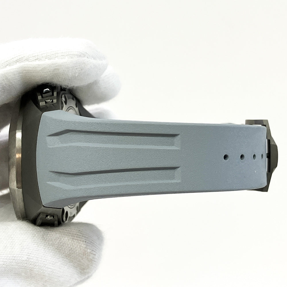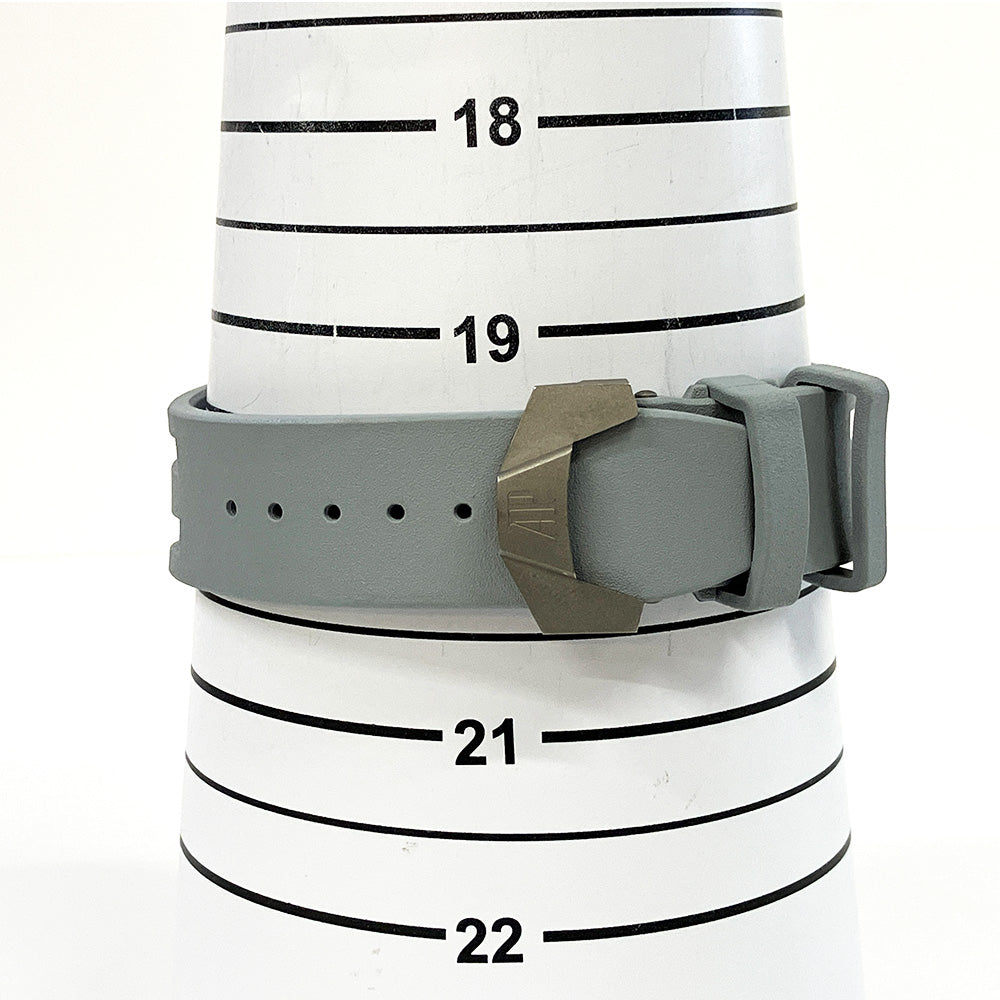 Titanium case with a grey rubber strap. 8 screws fixed titanium bezel. Arabic numeral hour markers. Minute markers around the outer rim. Dial Type: Analog. Luminescent hands. Chronograph - three sub-dials displaying: 60 second, 30 minute and tourbillon,. Audemars Piguet Calibre 2949 Automatic movement, containing 34 Jewels, composed of 391 parts, bitting at 21600 vph, and has a power reserve of approximately 65 hours. Scratch resistant sapphire crystal. Screw down crown. Transparent case back. Octagon case shape, case size: 44 mm, case thickness: 16.15 mm. Fold over with safety release clasp. Water resistant at 100 meters / 330 feet. Functions: tourbillon, chronograph, hours, minutes, 30- minute counter, second counter and minute counter. Luxury watch style. Watch label: Swiss Made. Audemars Piguet Royal Oak Concept Tourbillon Chronograph Automatic Men's Watch 26587TI.OO.D010CA.01.