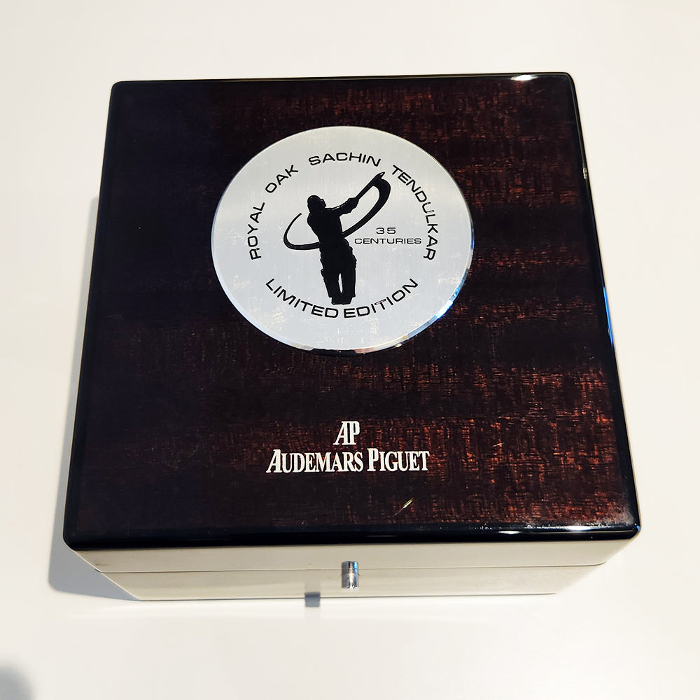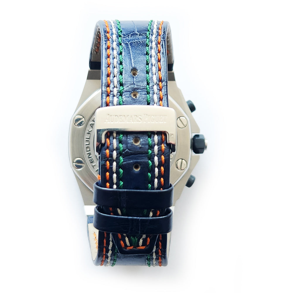 Silver-tone stainless steel case with a blue hand stitched blue leather strap. Fixed silver-tone stainless steel bezel. Silver dial with luminous hands and Arabic numeral hour markers. Tachymeter scale around the outer rim. Dial Type: Analog. Luminescent hands and dial markers. Magnified automatic date at 3 o'clock. Chronograph - sub-dials displaying: silver. Audemars Piguet Calibre 3126/3840 Automatic movement, based upon Audemars Piguet 3120, containing 59 Jewels, composed of 365 parts, bitting at 21600 vph, and has a power reserve of approximately 50 hours. Scratch resistant sapphire crystal. Rubberized screw-locked crown. Stainless steel, engraved batsman and '35 centuries', 'limited edition sachin tendulkar', 'roo' case back. Octagon case shape, case size: 42 mm, case thickness: 18.0 mm. Stainless steel deployment fold over buckle clasp. Water resistant at 100 meters / 330 feet. Functions: chronograph, date, hour, minute, small second. Luxury watch style. Watch label: Swiss Made.