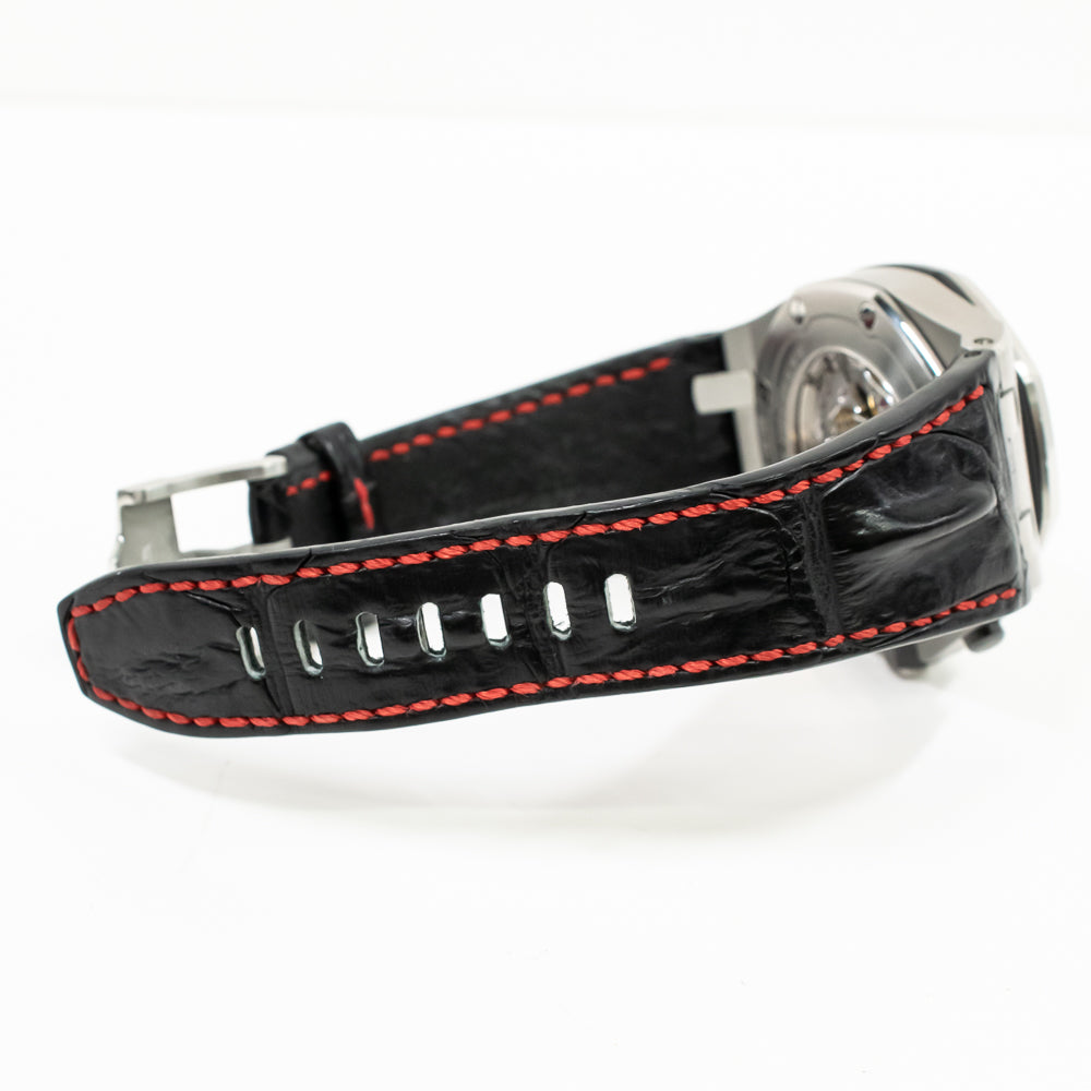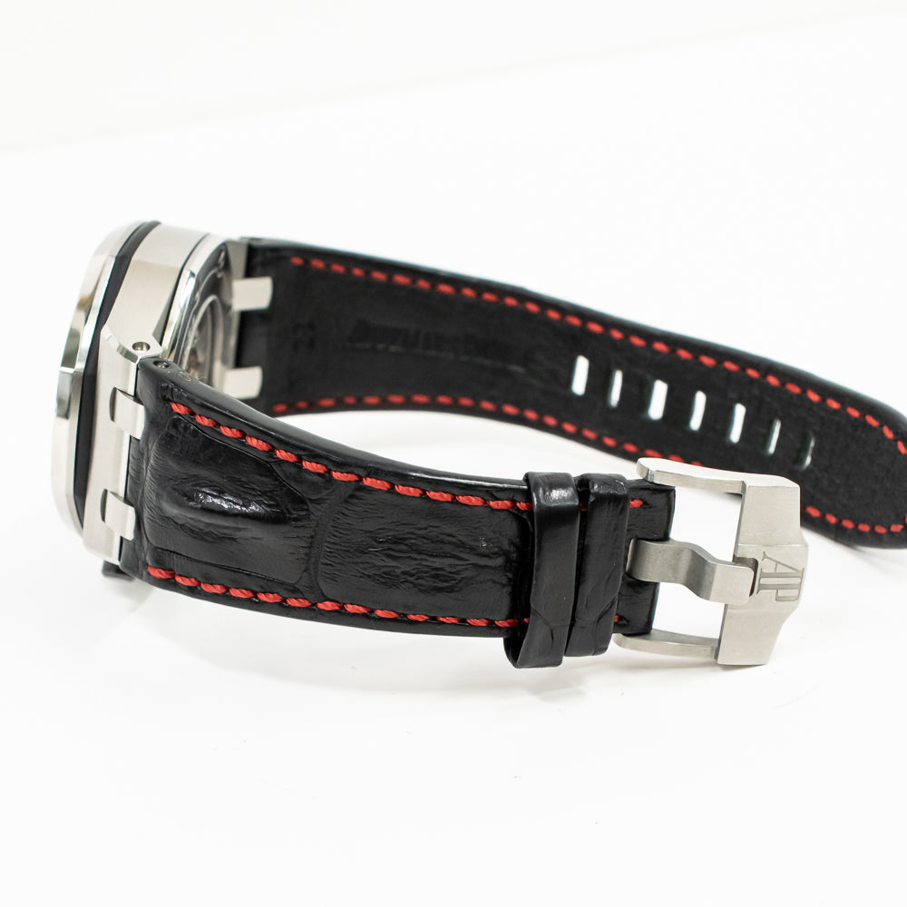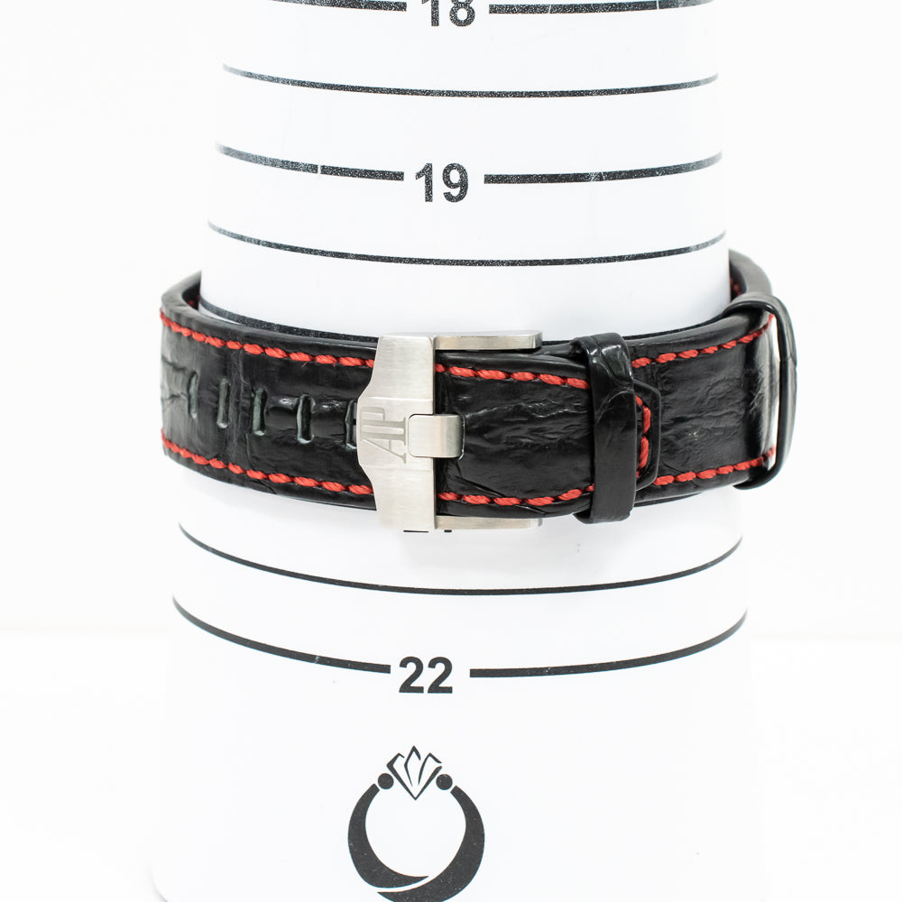 Silver-tone stainless steel case with a black crocodile leather strap. Fixed silver-tone stainless steel bezel. Black mega tapisserie dial with silver-toned hands and Arabic hour markers. Minute markers. tachymeter markings around the outer rim. Dial Type: Analog. Luminescent hands and markers. Date display at the 3 o'clock position. Chronograph - three sub-dials displaying: 60 second, 30 minute and 12 hour. Audemars Piguet Calibre 3126/3840 automatic movement with a 50-hour power reserve. Scratch resistant sapphire crystal. Pull / push crown. Skeleton case back. Octagon case shape, case size: 42 mm, case thickness: 14.54 mm. Tang clasp. Water resistant at 100 meters / 330 feet. Functions: chronograph, date, hour, minute, small second. Luxury watch style. Watch label: Swiss Made.