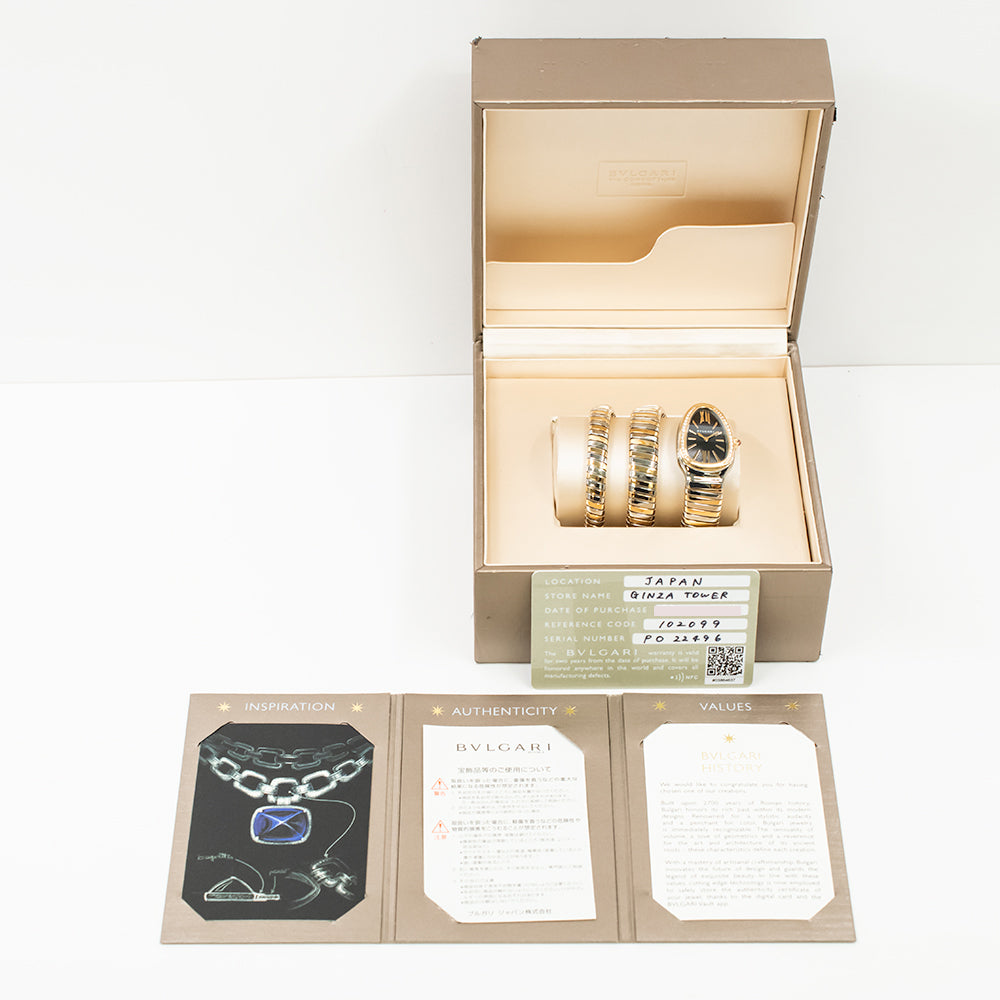 Bvlgari Serpenti Tubogas Lady watch with, 35 mm stainless steel curved case, 18 kt rose gold bezel set with diamonds, 18 kt rose gold crown set with a cabochon cut pink rubellite, black dial with guilloché soleil treatment and hand-applied indexes, single spiral 18 kt rose gold and stainless steel bracelet. Quartz movement, hours and minutes functions. Water proof 30 m.