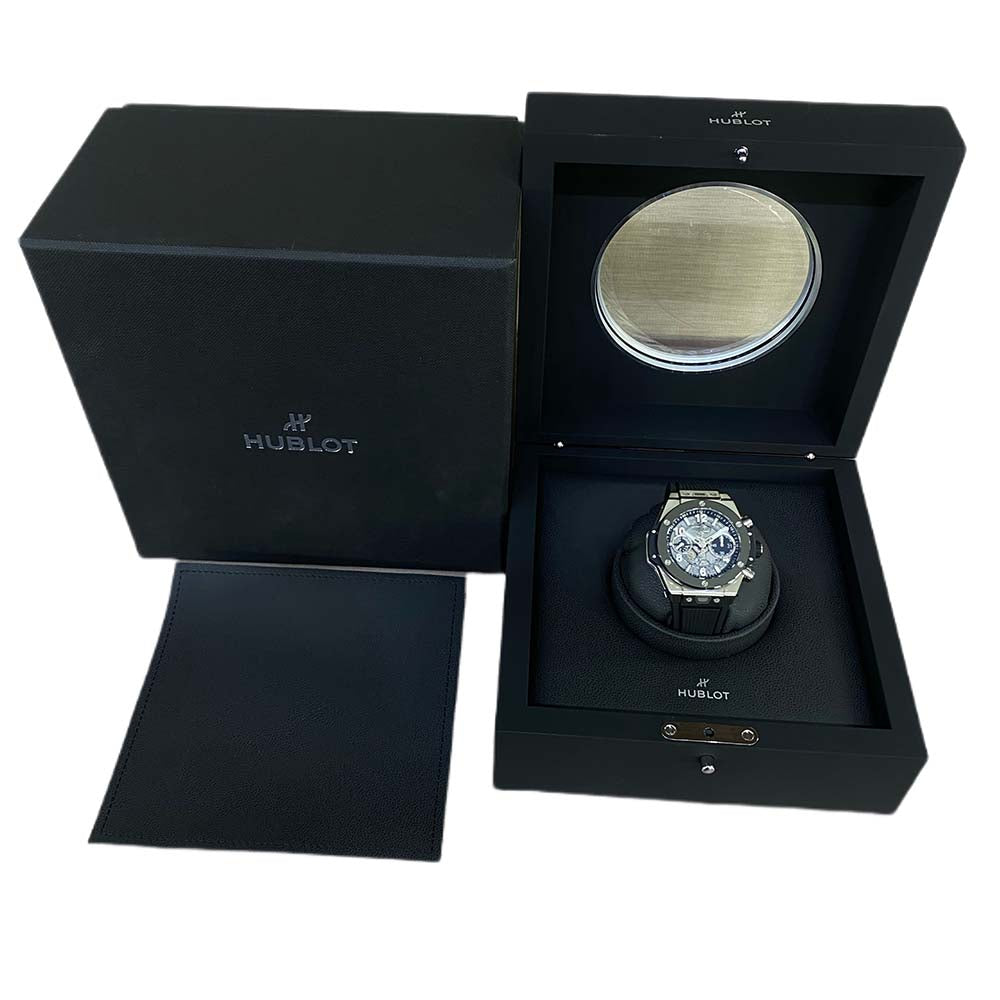 42 mm satin-finished and polished titanium case, satin-finished and polished black ceramic bezel with 6 h-shaped titanium screws, sapphire crystal with anti-reflective treatment, matte black dial, HUB1280 UNICO manufacture self-winding chronograph flyback movement, approximately 72 hours of power reserve, black lined rubber strap, titanium deployant buckle. Water resistant to 100m (10 ATM).
