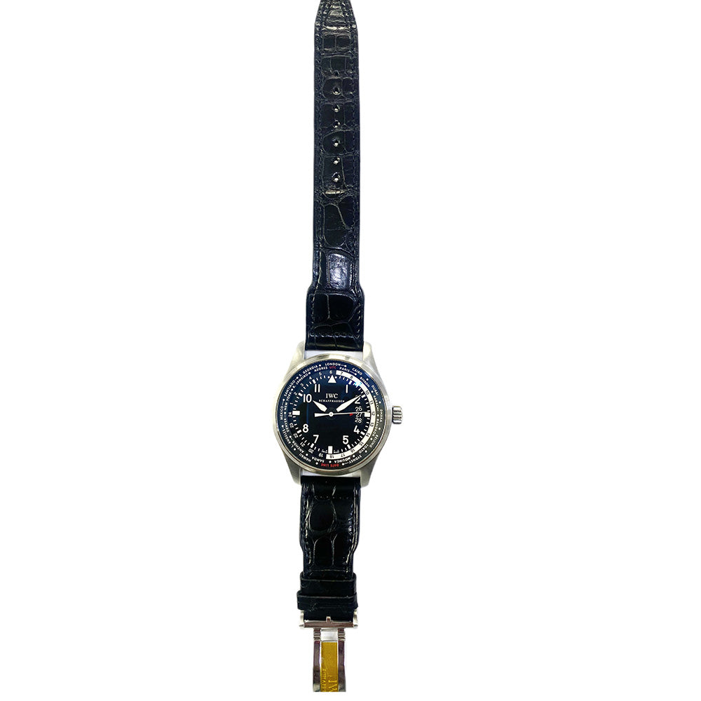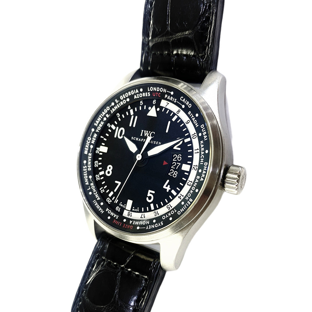 Stainless steel case with a black crocodile leather strap. Fixed stainless steel bezel. Black dial with black hands and Arabic numeral hour markers. Minute markers. 24 hour markers. Worldtime cities around the outer rim. Dial Type: Analog. Luminescent hands and markers. Date display at the 3 o'clock position. Automatic movement with a 42-hour power reserve. Scratch resistant sapphire crystal. Screw down crown. Solid case back. Case diameter: 46.5mm . Case thickness: 13.5 mm. Round case shape. Band length: 9 inches. Deployment clasp with push button release. Water resistant at 60 meters/ 200 feet. Functions: date, hour, minute, second, world time.