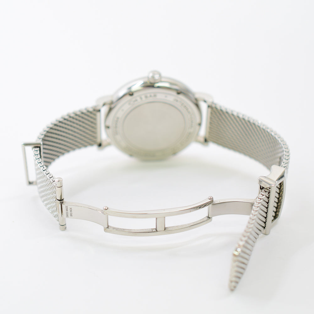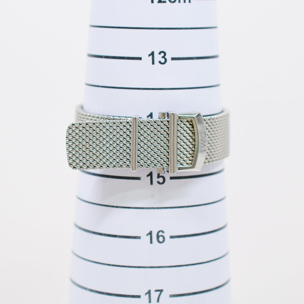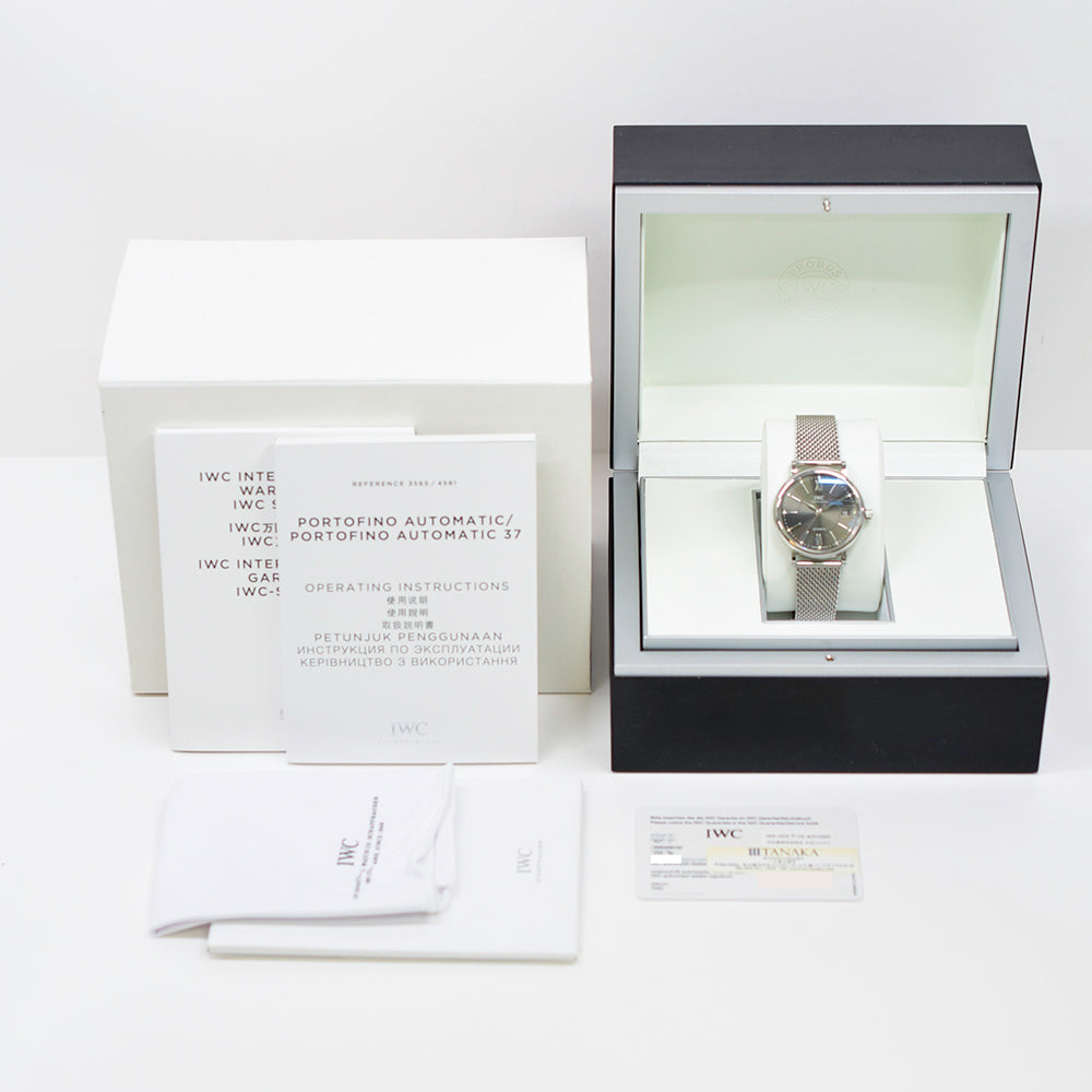 Silver-tone stainless steel case with a silver-tone stainless steel mesh bracelet. Fixed silver-tone stainless steel bezel. Grey dial with silver-toned leaf-style shape hands and index and diamond hour markers. Roman numerals mark the 6 and 12 o'clock positions. minute markers around the outer rim. Dial Type: Analog. Date display at the 3 o'clock position. IWC Calibre 35111 Automatic movement, based upon Sellita SW300-1, containing 25 Jewels, composed of 163 parts, bitting at 28800 vph, and has a power reserve of approximately 42 hours. Scratch resistant sapphire crystal. Solid case back. Round case shape, case size: 37 mm, case thickness: 9 mm. Band width: 18 mm. Fold over clasp. Water resistant at 30 meters / 100 feet. Functions: date, hour, minute, second. Portofino Series. Luxury watch style. Watch label: Swiss Made.