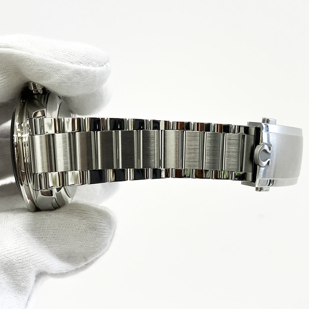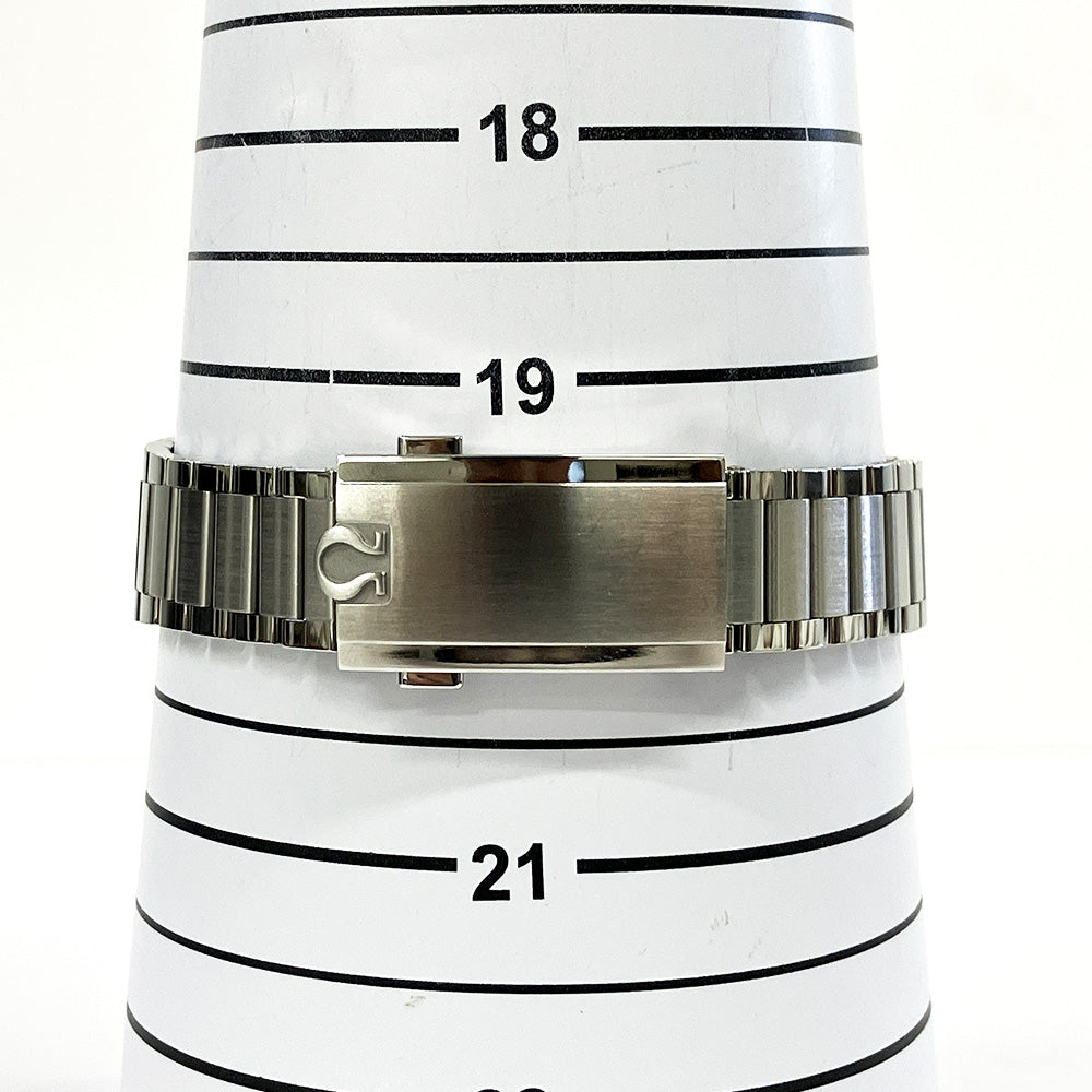 Silver-tone stainless steel case and bracelet. Fixed tachymeter scale black stainless steel bezel. Black dial with silver-tone hands and index hour markers. Minute markers around the outer rim. Dial Type: Analog. Luminescent hands and markers. Chronograph - three sub-dials displaying: 60 second, 30 minute and12 hour. Omega Calibre 3861 Manual winding movement, based upon Lemania 1873, containing 26 Jewels, bitting at 21600 vph, and has a power reserve of approximately 50 hours. Scratch resistant hesalite crystal. Solid case back. Round case shape, case size: 39.7 mm. Fold over clasp with a safety release. Water resistant at 50 meters / 165 feet. Functions: chronograph, hour, minute, small second, chronometer.