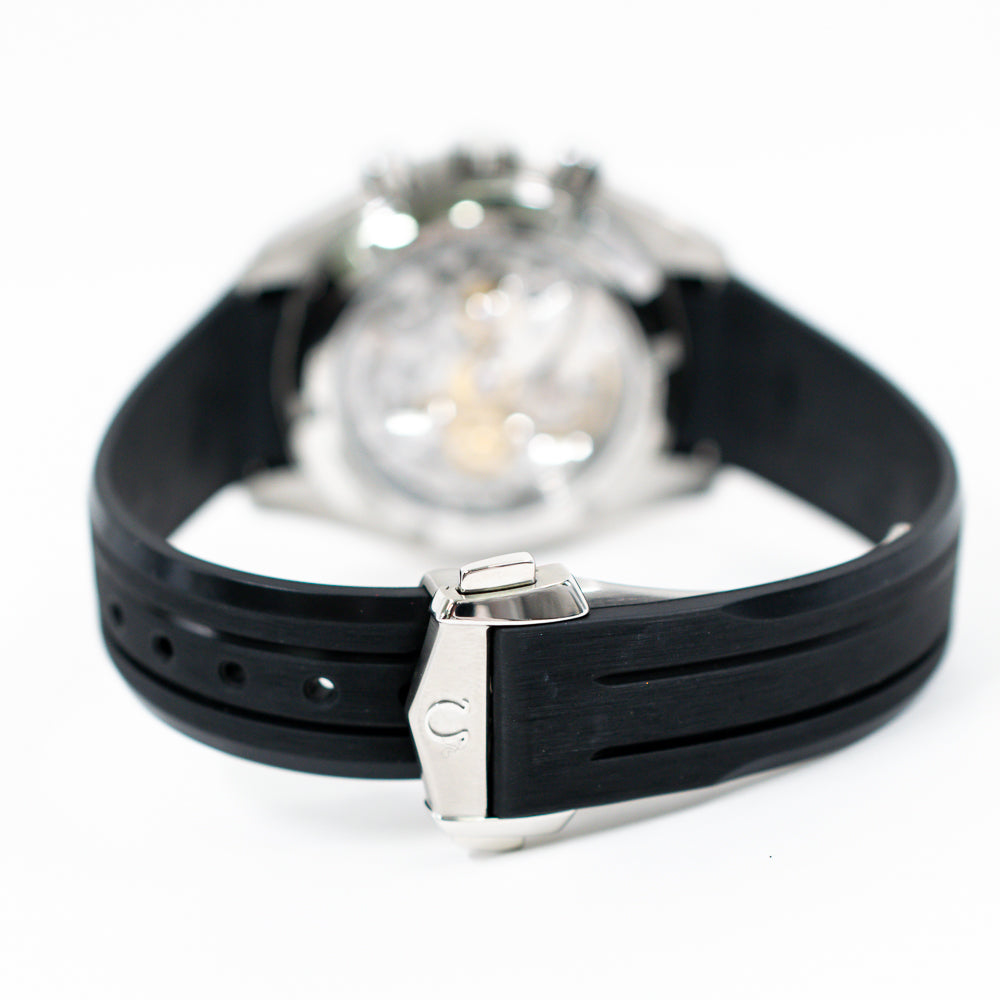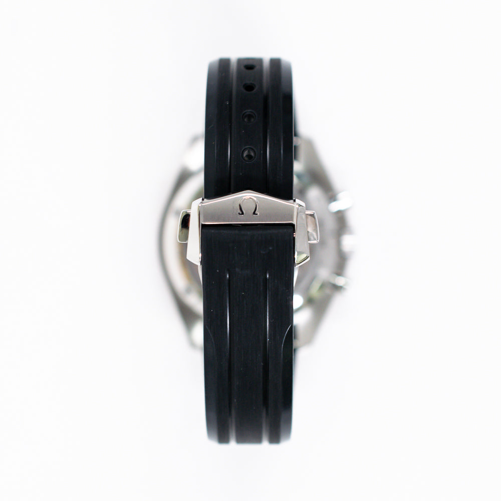 Silver-tone stainless steel case with a black rubber strap. Fixed tachymeter scale black stainless steel bezel. White dial with black hands and index hour markers. Minute markers around the outer rim. Dial Type: Analog. Luminescent hands and markers. Chronograph - three sub-dials displaying: 60 second, 30 minute and12 hour. Omega Calibre 3861 Hand Wind movement, based upon Lemania 1873, containing 26 Jewels, bitting at 21600 vph, and has a power reserve of approximately 50 hours. Scratch resistant sapphire crystal. Transparent see through case back. Round case shape, case size: 42 mm. Deployment with push button release clasp. Water resistant at 50 meters / 165 feet. Functions: chronograph, hour, minute, small second, chronometer.