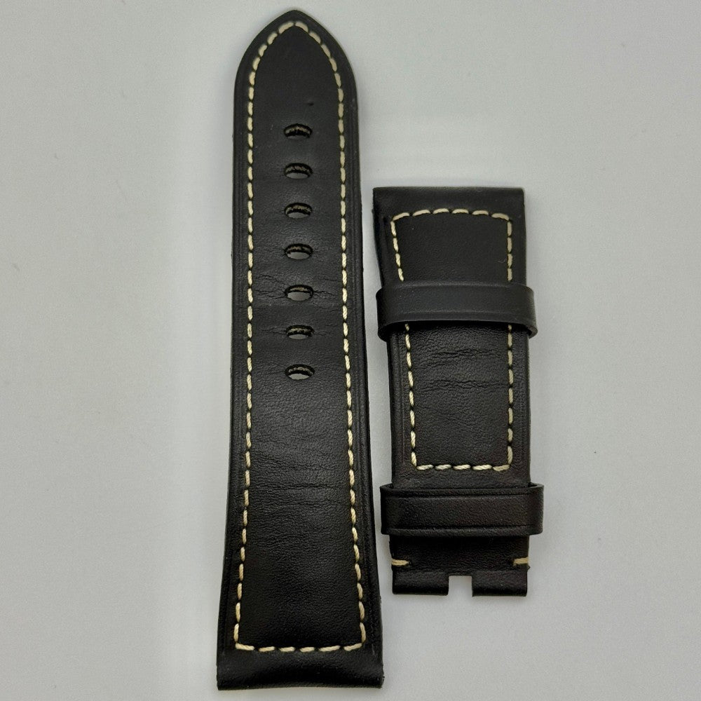 Silver-tone stainless steel case with a brown leather strap. Fixed silver-tone stainless steel bezel. Black dial with luminous hands and dot/index hour markers. Dial Type: Analog. Luminescent hands and markers. Panerai Calibre P.3000 Hand Wind movement, containing 21 Jewels, composed of 160 parts, bitting at 21600 vph, and has a power reserve of approximately 72 hours. Scratch resistant 2.8 mm thick plexiglass crystal. Pull / push crown. Cushion case shape. Case size: 47 mm. Tang clasp. Water resistant at 100 meters / 330 feet.
