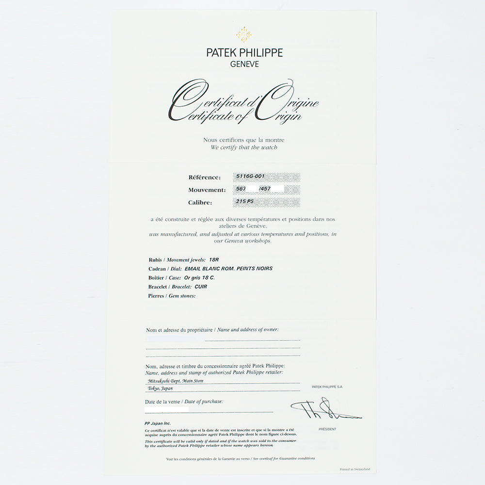 Patek Philippe Calatrava 5116G-001 Mens Watch. 36mm 18K white gold case with Hobnail patterned bezel. White dial with black steel hands and Roman numeral hour markers. Small second sub-dial. Black leather strap with 18K white gold buckle. Sapphire crystal. Transparent sapphire case back. Calibre 215 PS mechanical hand wind movement with a 44-hour power reserve.