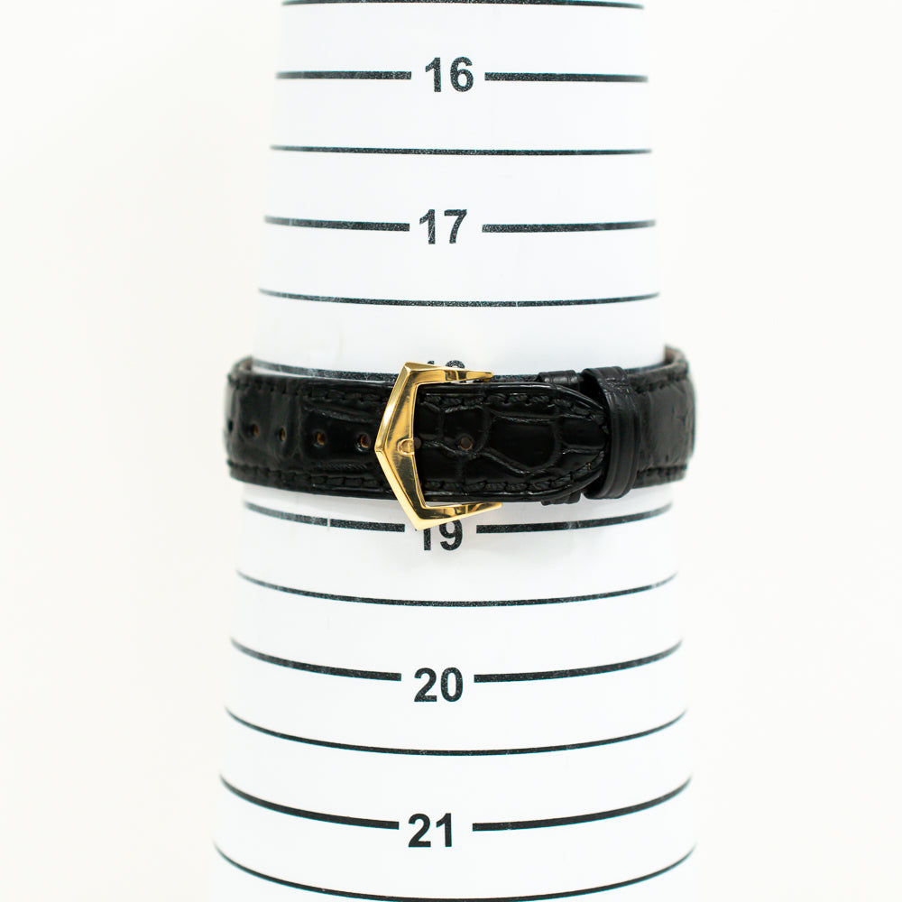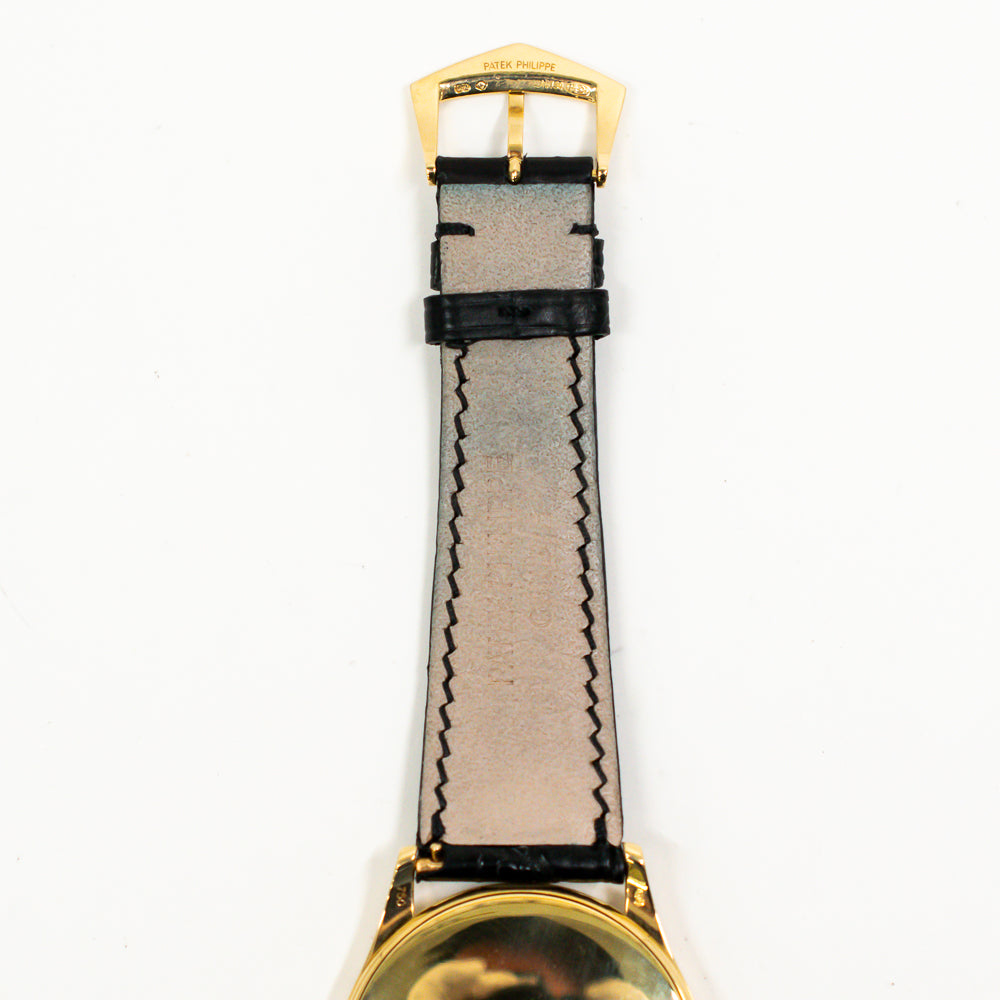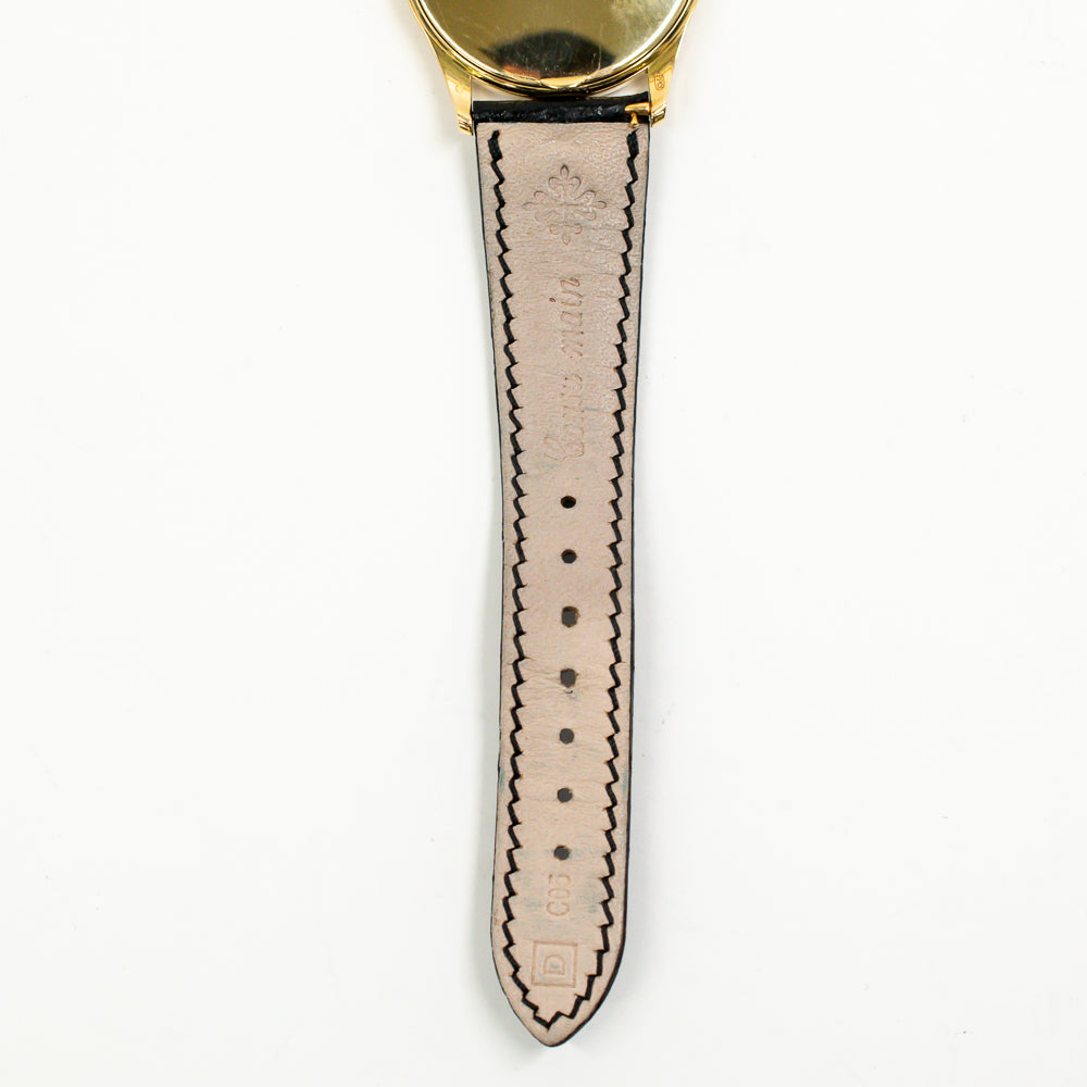 18kt yellow gold case with a black leather strap. Fixed 18kt yellow gold bezel. White dial with gold-tone dauphine-style hands and index hour markers. Minute markers around the outer rim. Dial Type: Analog. Small seconds sub-dial at the 6 o'clock position. Patek Philippe calibre 215 PS Hand Wind movement, based upon Patek Philippe 215, containing 18 Jewels, bitting at 28800 vph, and has a power reserve of approximately 44 hours. Scratch resistant sapphire crystal. Transparent case back. Round case shape. Case size: 37 mm. Tang clasp. Water resistant at 30 meters / 100 feet. Functions: hour, minute, small second. Luxury watch style. Watch label: Swiss Made.