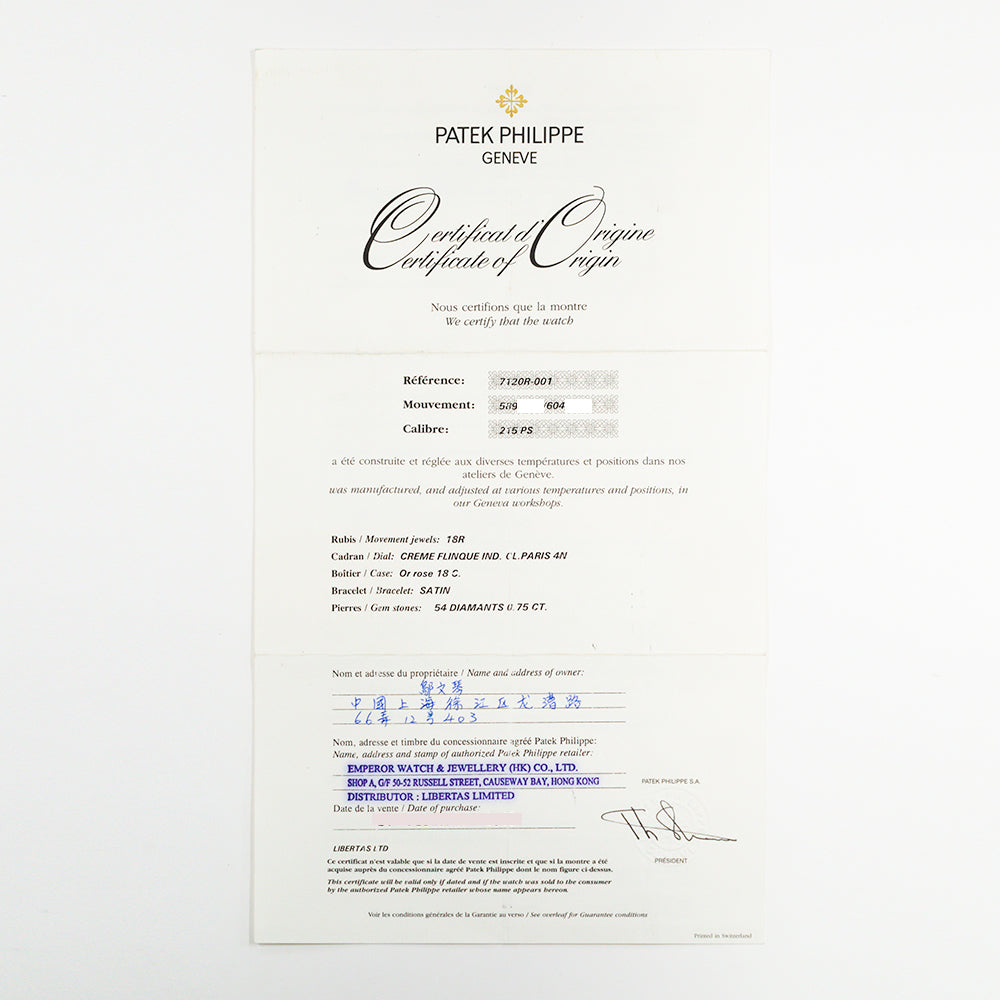 18kt rose gold case with a brown crocodile strap. Fixed 18kt rose gold diamond set bezel. Ivory dial with rose gold-tone leaf-style shape hands and index hour markers. Minute markers around the outer rim. Dial Type: Analog. One - small seconds subdial. Patek Philippe Calibre 215 hand wind movement with a 44-hour power reserve. Scratch resistant sapphire crystal. Skeleton transparent exhibition see through case back. Round case shape. Case size: 31 mm. Water resistant at 30 meters / 100 feet. Functions: hour, minute, small second. Luxury watch style. Watch label: Swiss Made.