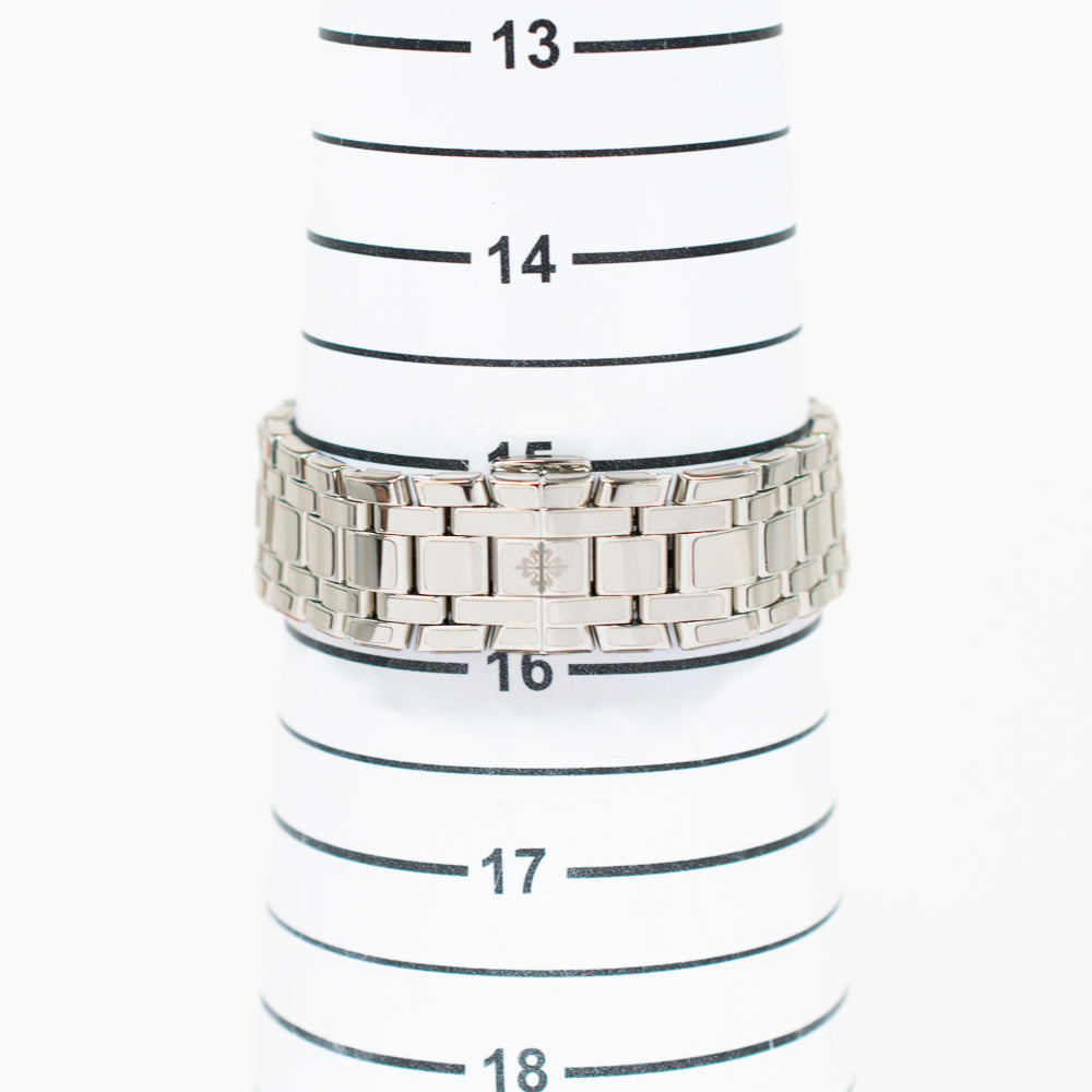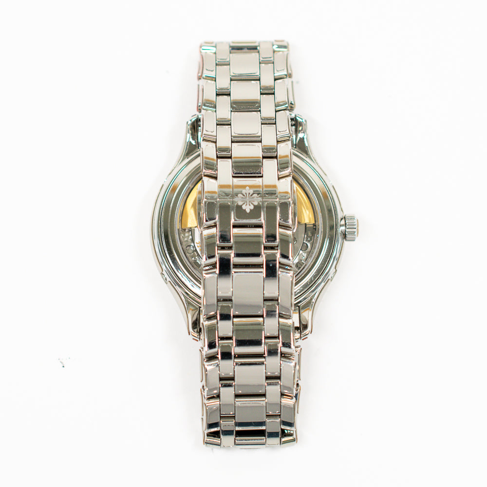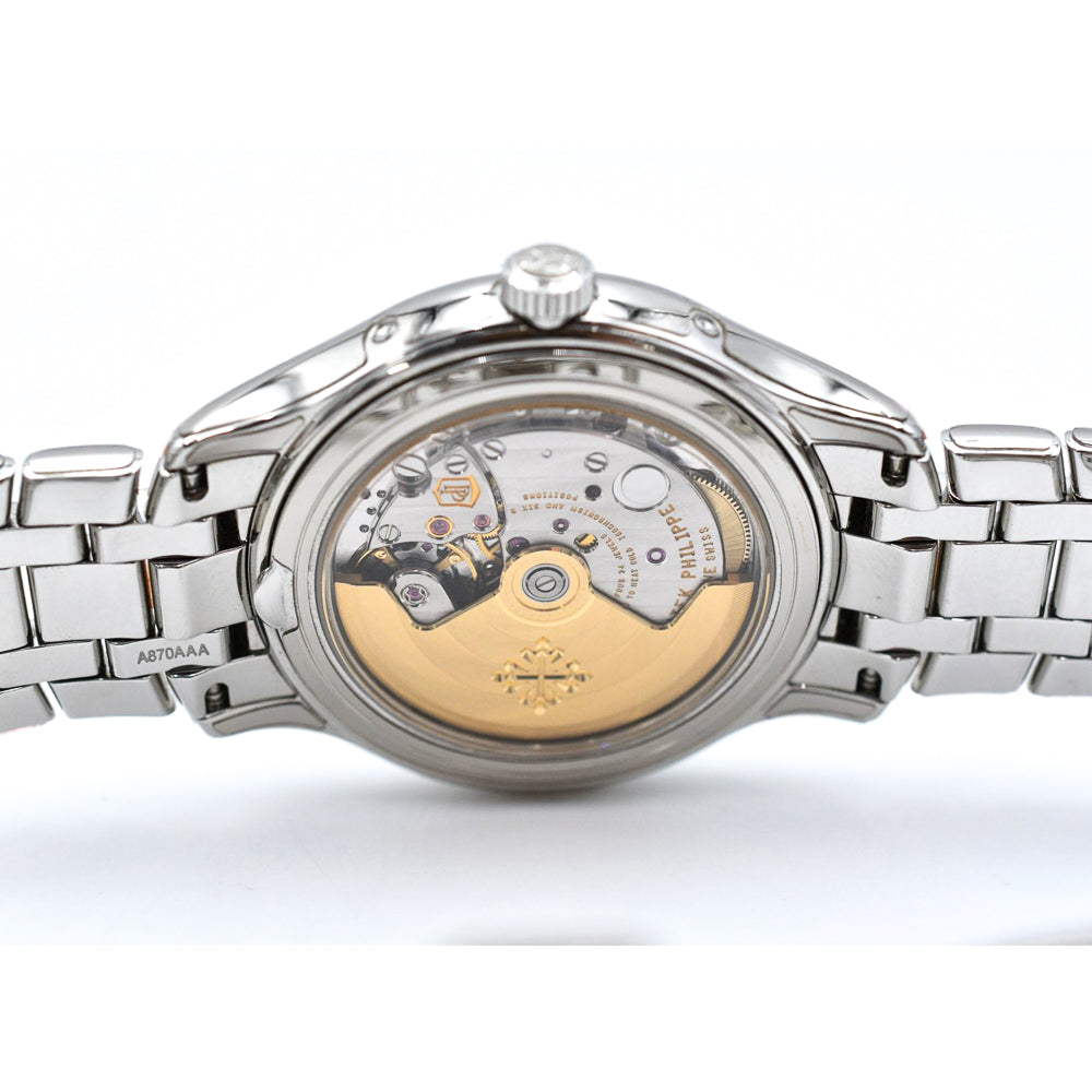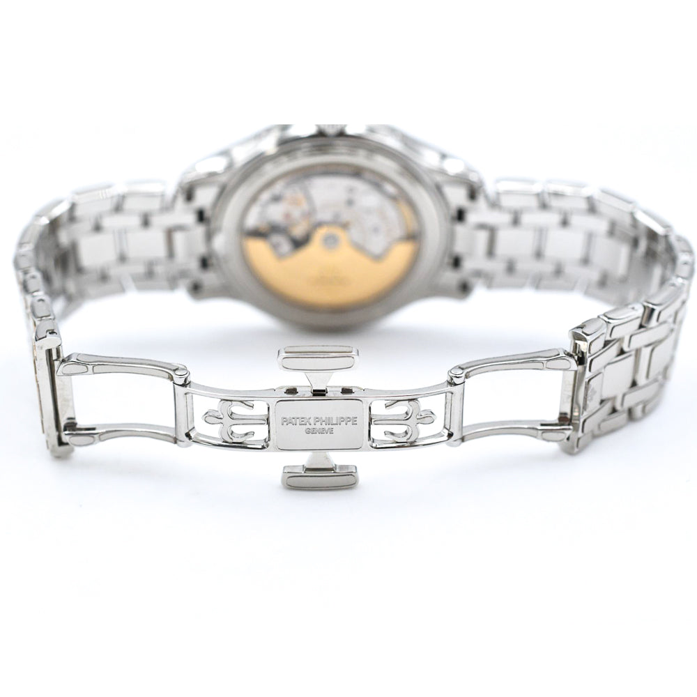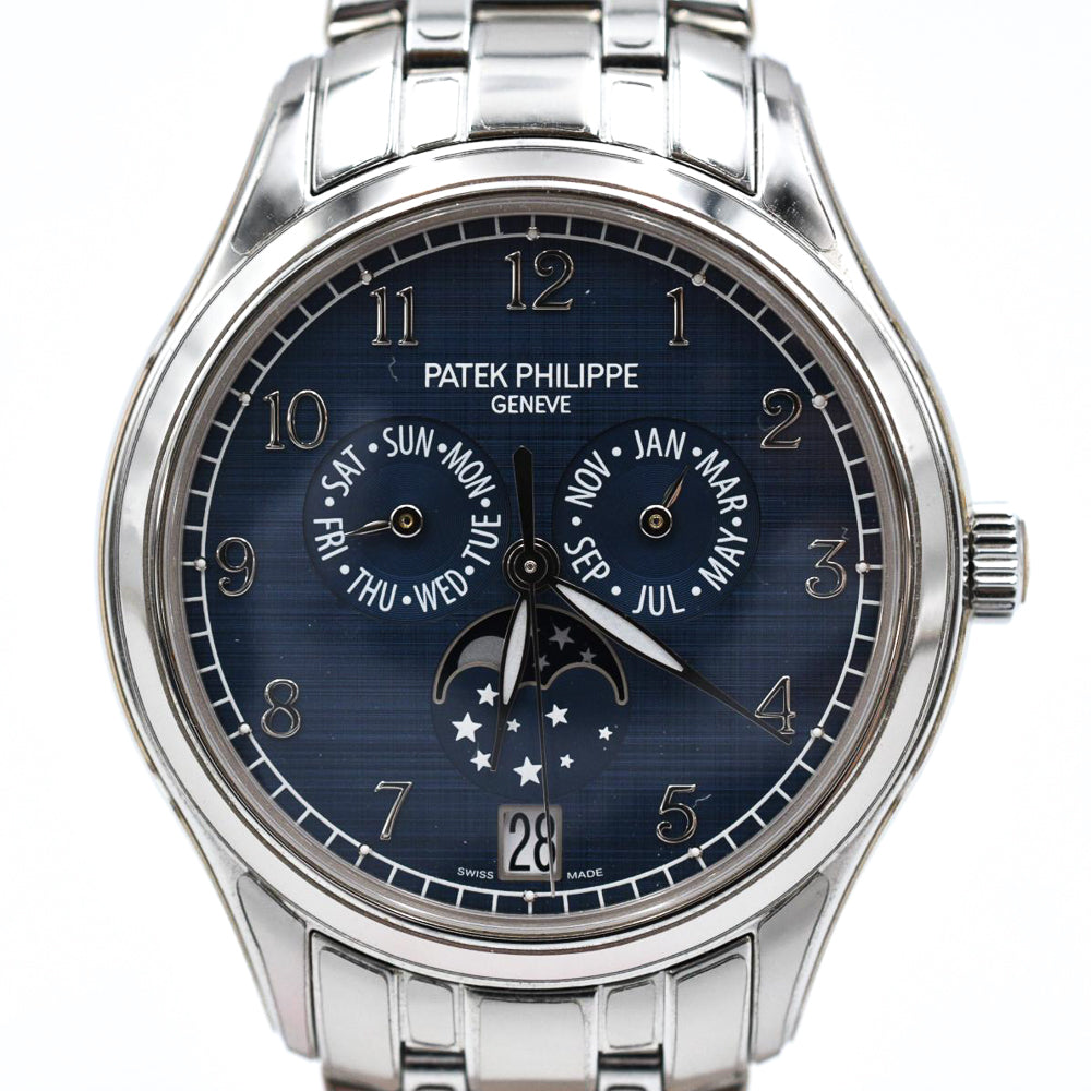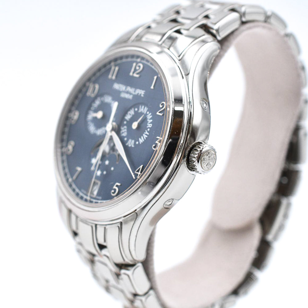 Stainless steel case with a stainless steel bracelet. Fixed stainless steel bezel. Blue dial with lumiunous silver-tone hands and Arabic numeral hour markers. Minute markers around the outer rim. Dial Type: Analog. Luminescent hands. Date display at the 6 o'clock position. Three sub-dials displaying: day of the week, month and moonphase. Patek Philippe calibre 324 S QA LU automatic movement, containing 34 Jewels, composed of 328 parts, bitting at 28800 vph, and has a power reserve of approximately 45 hours. Scratch resistant sapphire crystal. Screw down crown. Transparent case back. Round case shape. Case size: 38 mm. Case thickness: 11 mm. Deployment clasp. Water resistant at 30 meters / 100 feet. Functions: annual calendar, moon phase, month, date, day, hour, minute, second. Luxury watch style. Watch label: Swiss Made.