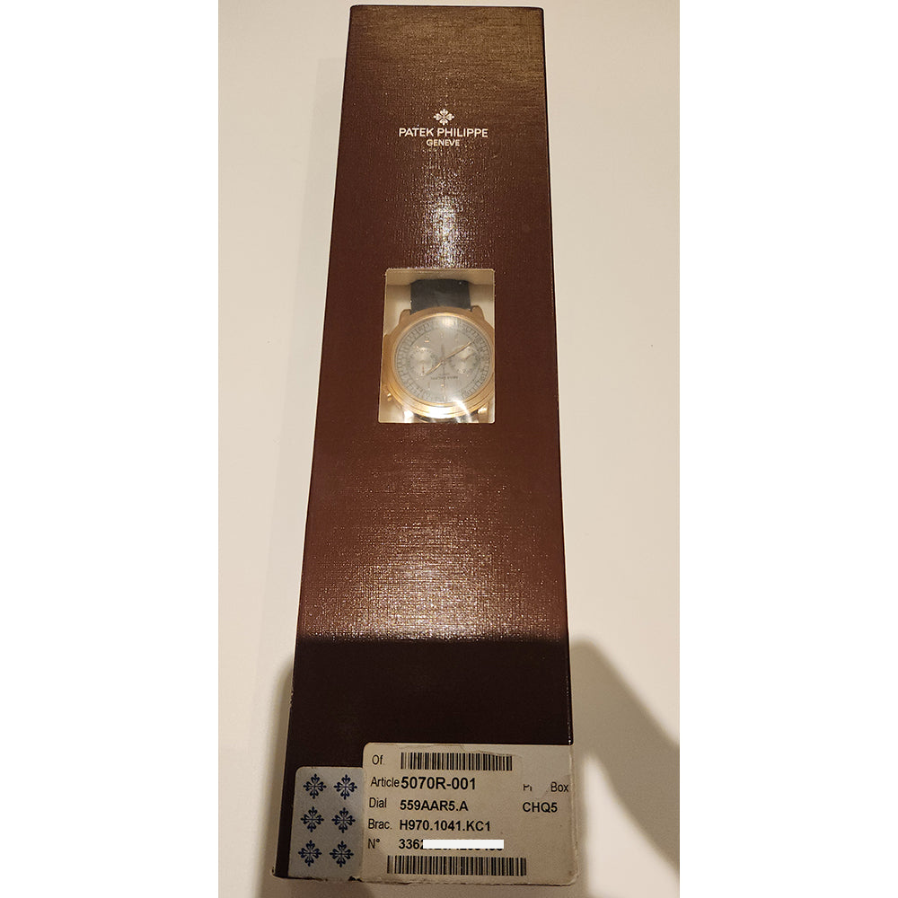 Rose gold-tone 18kt rose gold case with a brown crocodile leather strap. Fixed rose gold-tone 18kt rose gold bezel. Silver-tone dial with rose gold-tone hands and Arabic numeral hour markers. Minute markers around the outer rim. Dial Type: Analog. Chronograph - two sub-dials displaying: 60 second and 30 minute. Patek Philippe Calibre CH 27-70 Hand Wind movement, containing 24 Jewels, bitting at 18000 vph, and has a power reserve of approximately 60 hours. Scratch resistant sapphire crystal. Transparent case back. Round case shape, case size: 42 mm. Fold over clasp. Water resistant at 30 meters / 100 feet. Functions: chronograph, column wheel, hour, minute, small second. Complications Series. Luxury watch style. Watch label: Swiss Made.