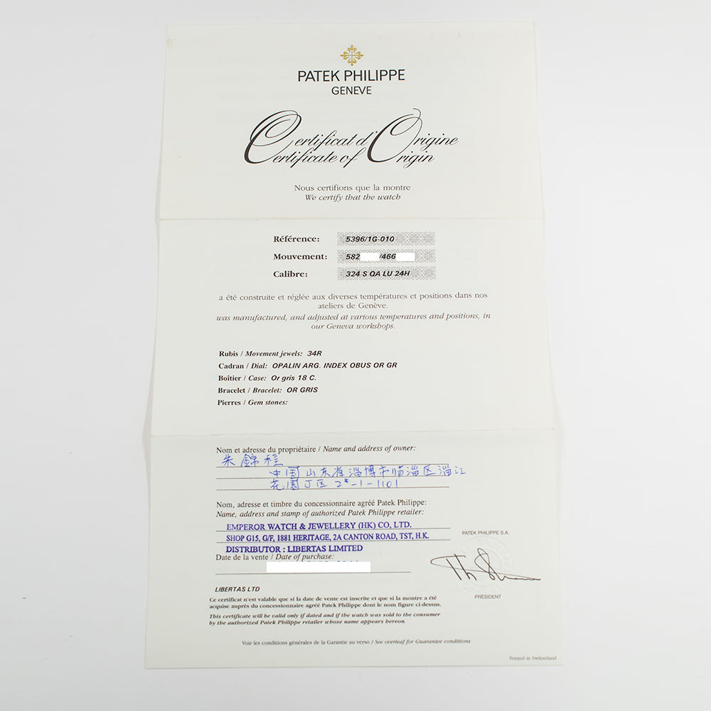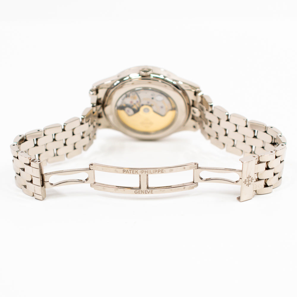 18kt white gold case with a white gold-tone 18kt white gold bracelet. Fixed 18kt white gold bezel. White dial with silver dauphine-style shape hands and index hour markers. Minute markers around the outer rim. Dial Type: Analog. Month and day of the week under the 12 oclock position. date display at the 6 o'clock position. 24 hour and moonphase indicator subdials. Patek Philippe Calibre 324 S QA LU 24H/303 Automatic movement, containing 34 Jewels, composed of 347 parts, bitting at 28800 vph, and has a power reserve of approximately 45 hours. Scratch resistant sapphire crystal. Pull / push crown. Skeleton case back. Round case shape, case size: 38.5 mm, case thickness: 11 mm. Fold over clasp. Water resistant at 30 meters / 100 feet. Functions: annual calendar, moon phase, month, date, day, GMT, second time zone, hour, minute, second.