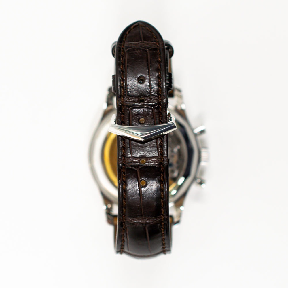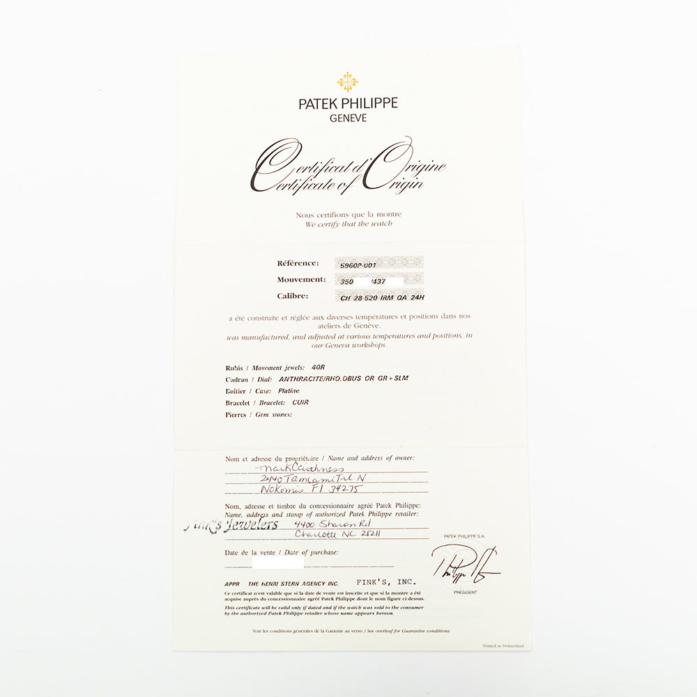 White platinum case with a black crocodile leather strap. Fixed white platinum bezel. Grey dial with luminous hands and stick hour markers. Minute markers around the outer rim. Dial Type: Analog. Luminescent hands and markers. Day display between 11 and 12 o'clock, date display at 12 o'clock and month display between 1 and 2 o'clock. One subdial displaying: 12 hour and 60 minute at the 6 o'clock position. Patek Philippe Calibre CH 28-520 IRM QA 24H Automatic movement, containing 40 Jewels, composed of 456 parts, bitting at 28800 vph, and has a power reserve of approximately 55 hours. Scratch resistant sapphire crystal. Screw down crown. Skeleton case back. Round case shape, case size: 40 mm. Fold over with safety release clasp. Water resistant at 30 meters / 100 feet. Functions: annual calendar, chronograph, column wheel, flyback, month, date, day, hour, minute, second, power reserve indicator. Complications Series. Luxury watch style