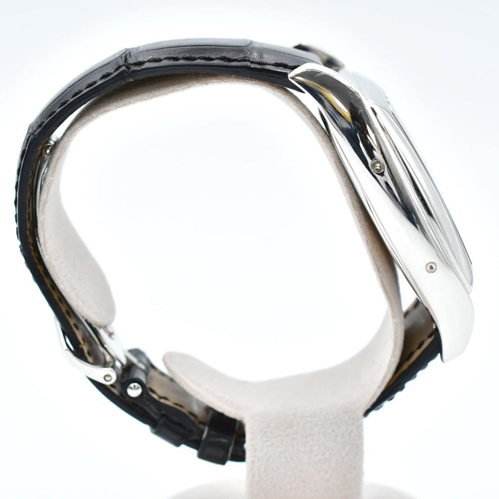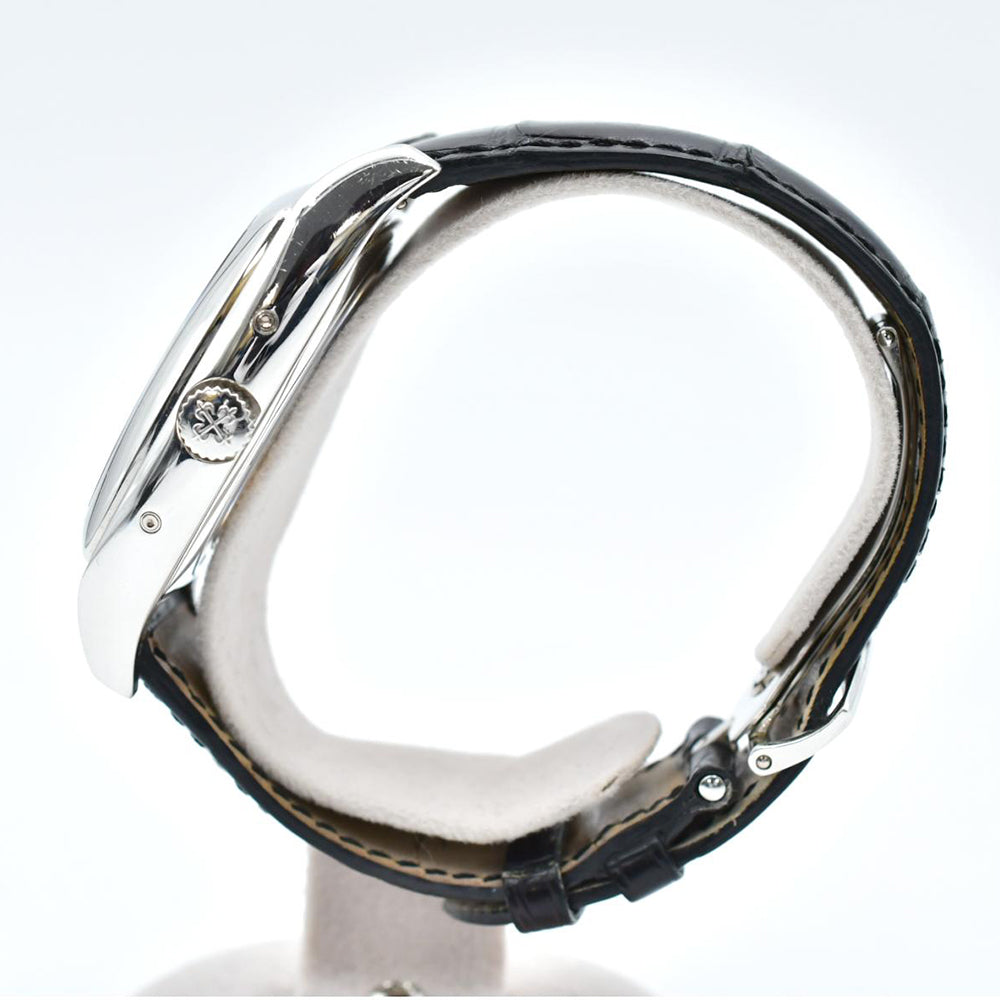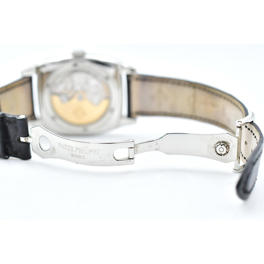 The Patek Philippe Annual Calendar 5135P-001 is a high-end men's watch with a distinctive set of features. Its platinum case and bezel provide both durability and elegance, and the gray dial with silver-tone hands is both sleek and easy to read. The watch's moon phase and 24-hour indicator sub-dial at the 6 o'clock position, day of the week window at 10 o'clock, date window at 12 o'clock, and month window at 2 o'clock provide a range of practical functions for daily use. The watch's scratch-resistant sapphire crystal on both sides ensures that it will remain protected and maintain its clarity. The black leather strap and platinum tang buckle add to the watch's sophisticated style, while its automatic movement with a power reserve of 45 hours offers reliable timekeeping. Additionally, the watch is water-resistant up to 30 m / 90 ft.
