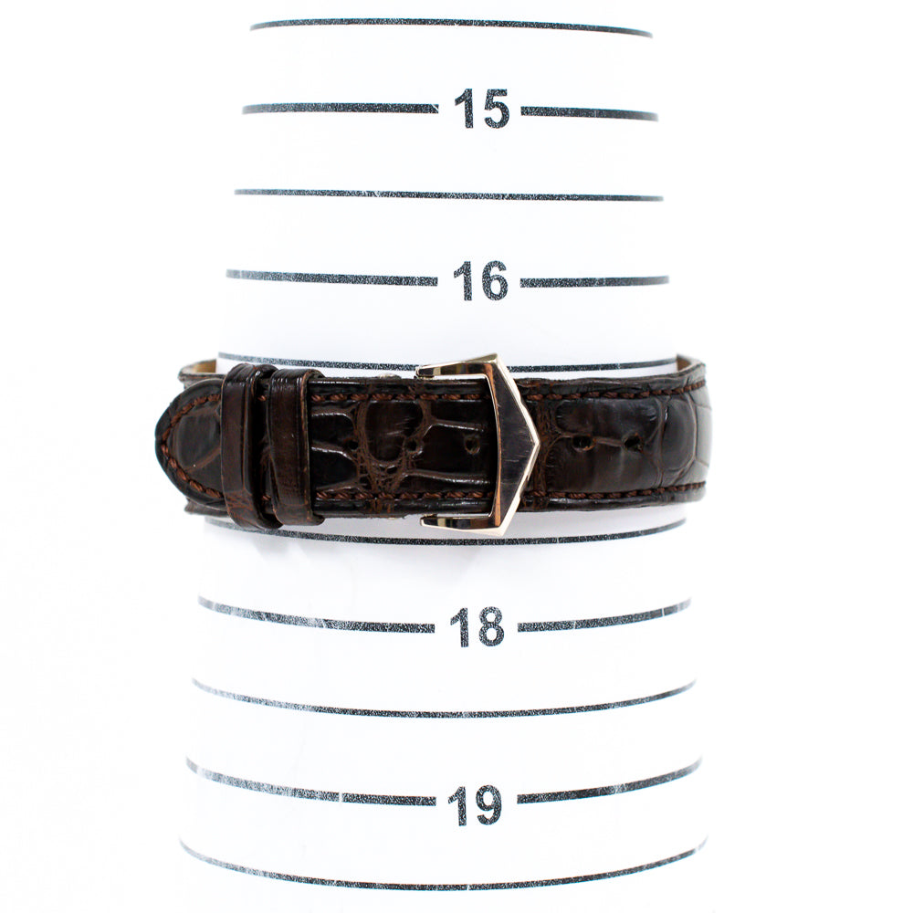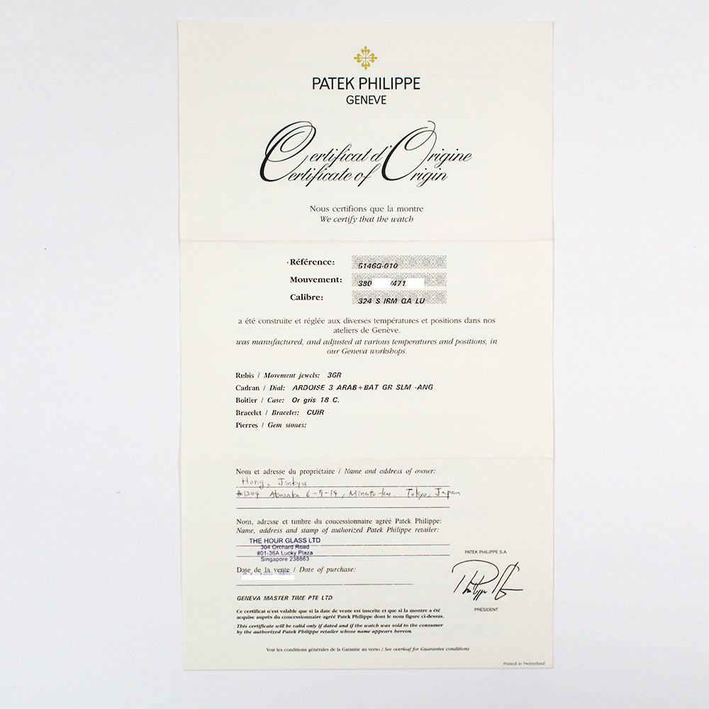 18kt white gold case with a brown crocodile leather strap. Fixed 18kt white gold bezel. Gray dial with silver-tone leaf-style shape hands and index hour markers. Arabic numerals appear at the 3, 9 and 12 o'clock positions. Minute markers around the outer rim. Dial Type: Analog. Luminescent hands and markers. Date display at the 6 o'clock position. Four displayings showing: day of the week, month, moon-phase and power reserve indicator. Patek Philippe calibre 324 S IRM QA LU automatic movement, based upon Patek Philippe 324 S C, containing 36 Jewels, composed of 355 parts, bitting at 28800 vph, and has a power reserve of approximately 45 hours. Scratch resistant sapphire crystal. Transparent case back. Round case shape, case size: 39 mm. Deployment with push button release clasp. Water resistant at 30 meters / 100 feet. Functions: annual calendar, moon phase, month, date, day, hour, minute, second, power reserve indicator. Complications Series. Luxury watch style. Watch label: Swiss Made.