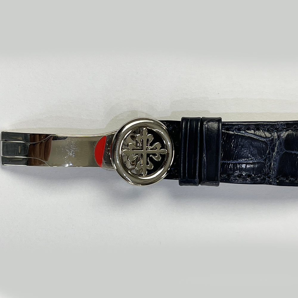 18kt white gold case with a blue alligator band. Fixed 18kt white gold bezel. Blue sunburst dial with white dauphine-style shape hands and index hour markers. Minute markers around the outer rim. Dial Type: Analog. Perpetual calendar. One subdial displaying: tourbillon/moonphase. Patek Philippe Calibre R TO 27 PS QI Hand Wind movement, based upon Patek Philippe R TO 27 PS, containing 37 Jewels, composed of 557 parts, bitting at 21600 vph, and has a power reserve of approximately 48 hours. Scratch resistant sapphire crystal. Transparent case back. Round case shape, case size: 41 mm, case thickness: 13.81 mm. Deployment clasp. Functions: tourbillon, perpetual calendar, moon phase, leap year, month, date, day, hour, minute, small second, minute repeater, day/night indicator. Patek Philippe Grand Complications Chronograph Blue Sunburst Dial Men's Watch 5207G-001.