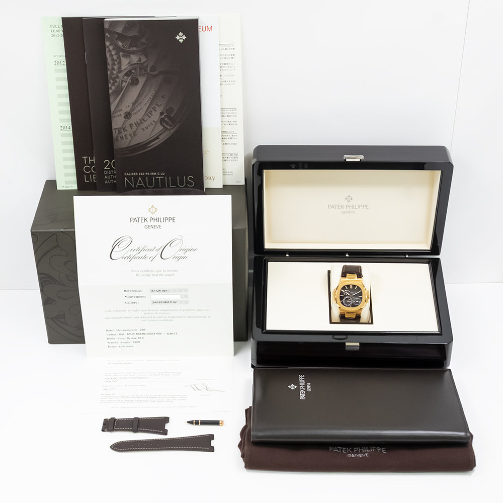 18kt rose gold case with a black leather strap. Fixed 18kt rose gold bezel. Black dial with gold-tone hands and index hour markers. Minute markers around the outer rim. Dial Type: Analog. Date display at the 7 o'clock position. Three sub-dials displaying: small second, date/moonphase, power reserve indicator. Patek Philippe Calibre 240 PS IRM C LU Automatic movement, containing 29 Jewels, composed of 265 parts, bitting at 21600 vph, and has a power reserve of approximately 48 hours. Scratch resistant sapphire crystal. Fluted crown. Sapphire crystal case back. Cushion case shape, case size: 40 mm. Fold over clasp. Water resistant at 60 meters / 200 feet. Functions: moon phase, date, hour, minute, small second, power reserve indicator. Nautilus Series. Luxury watch style. Watch label: Swiss Made.
