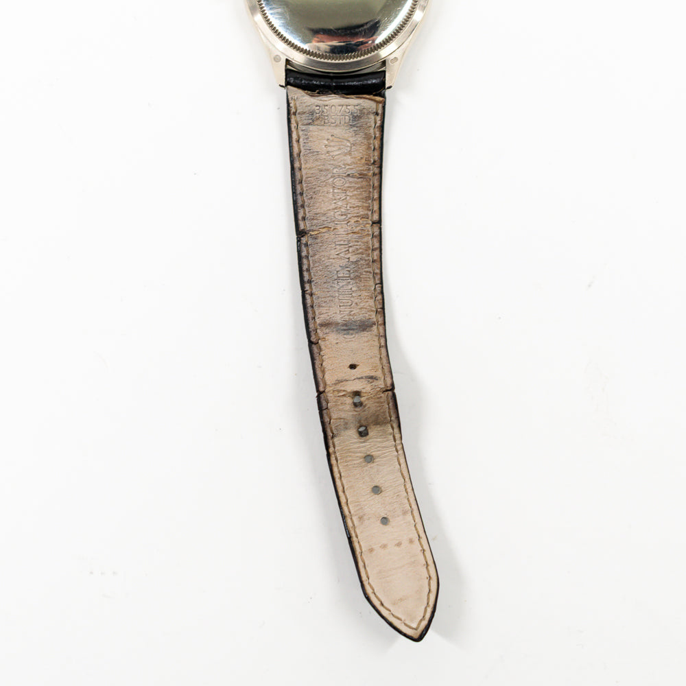 Bracelet: Brown leather strap with an 18K white gold tang buckle.
