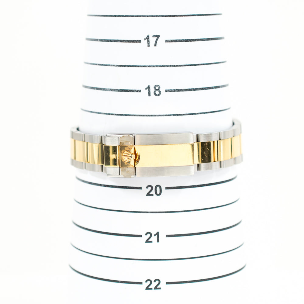 Bracelet: Stainless steel and 18K yellow gold oyster bracelet with a flip-lock clasp. Fits a 7 3/4" wrist.