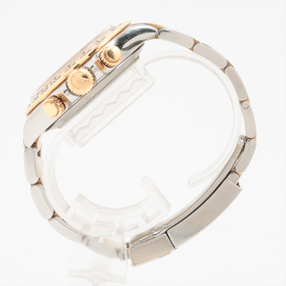 Dial: Black dial with original Rolex factory diamond hour markers. Outer 1/5th seconds track. Three yellow gold-outlined subdials -- small seconds, 12 hours, and 30 minutes. Luminescent yellow gold and black baton hands.