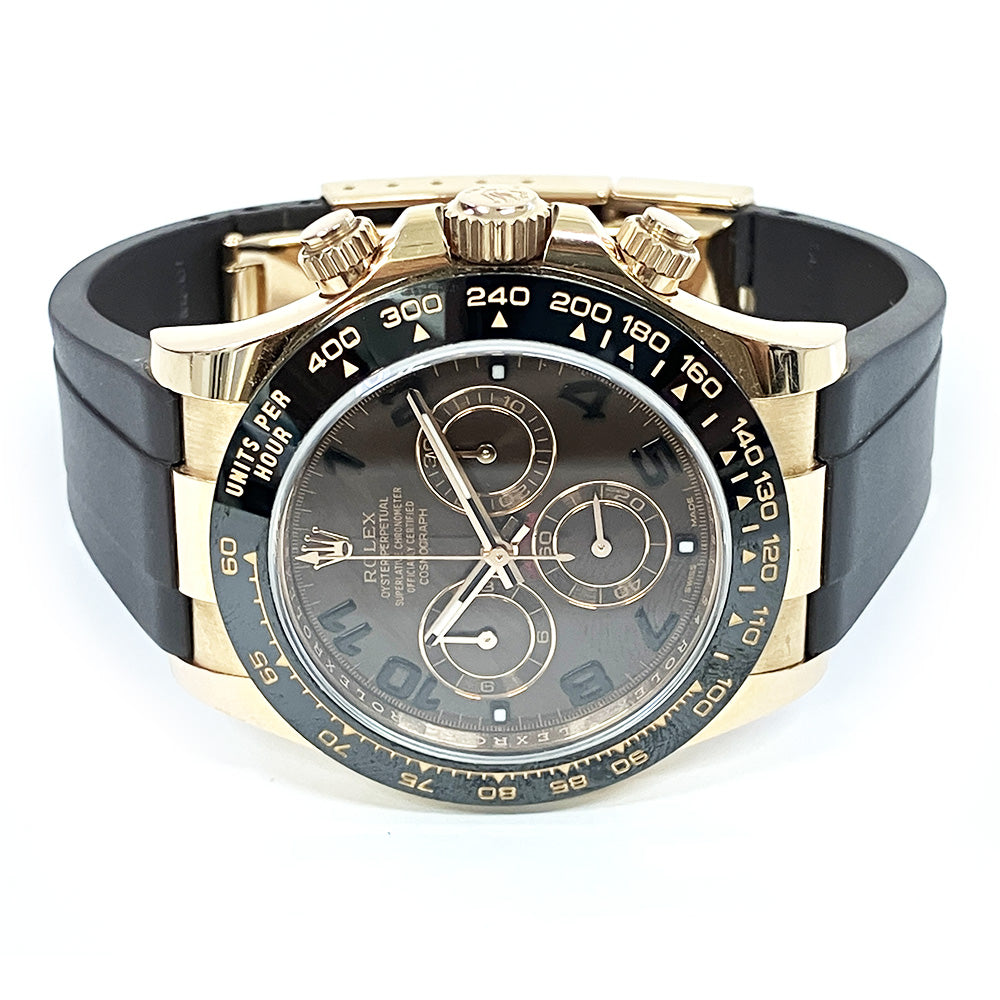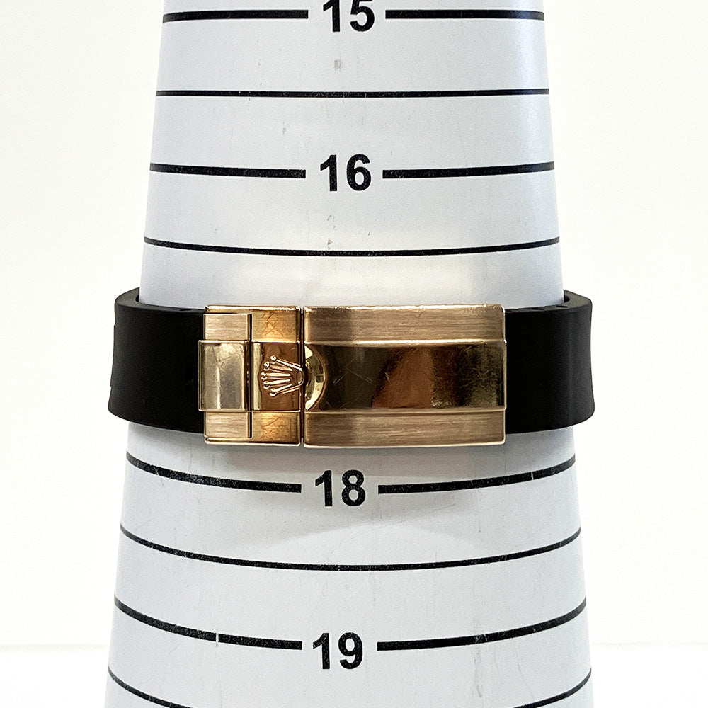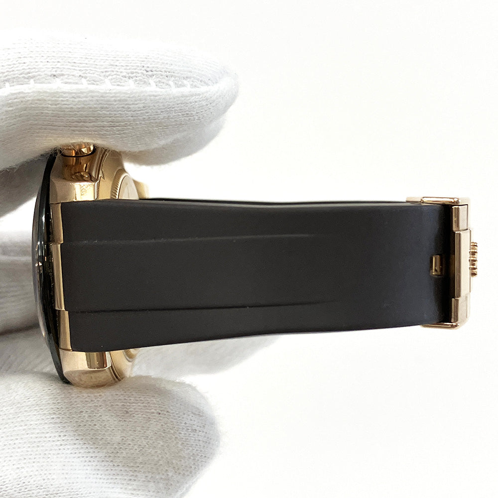 Bracelet: Brown custom rubber strap with an 18k rose gold flip-lock clasp and easylink micro-adjustment.