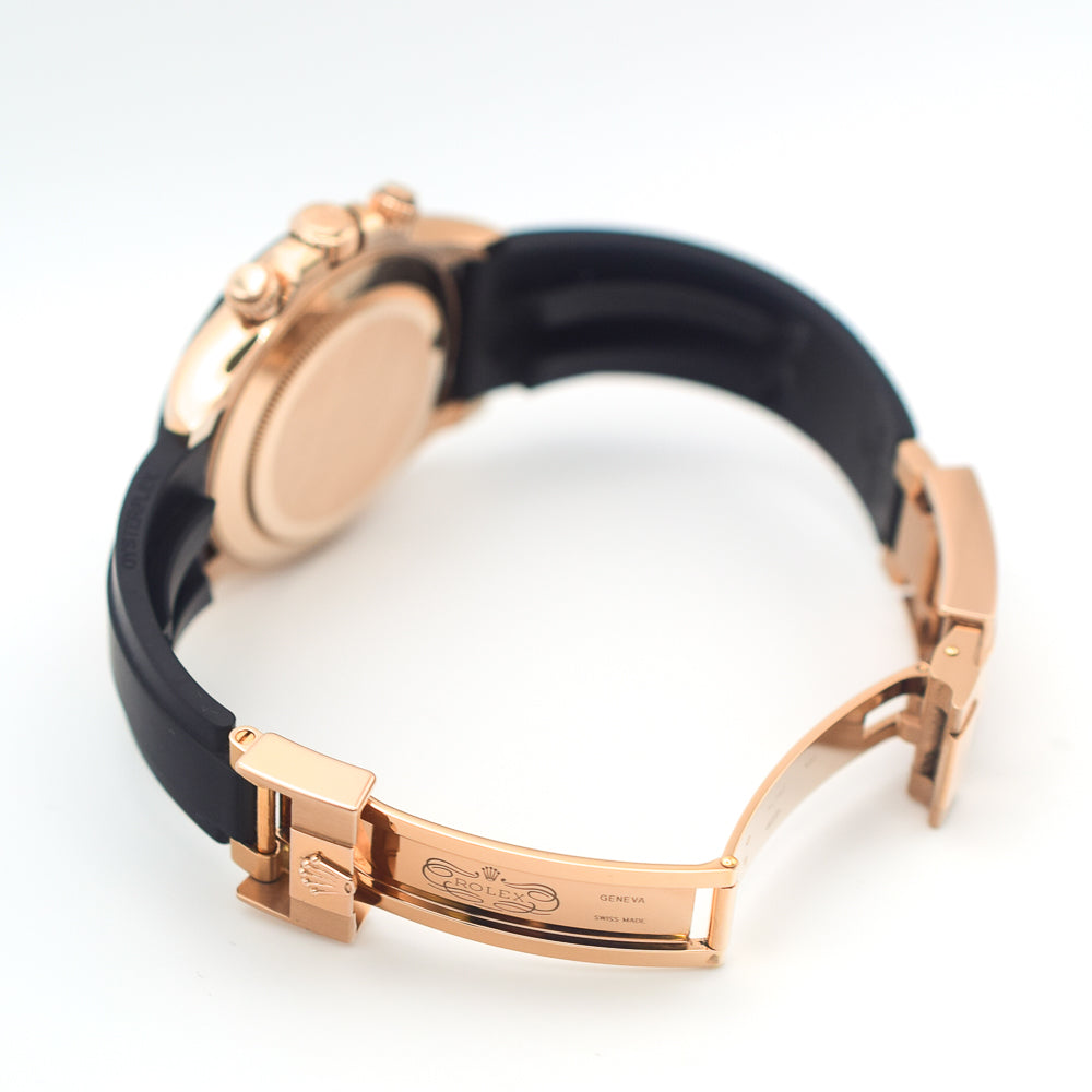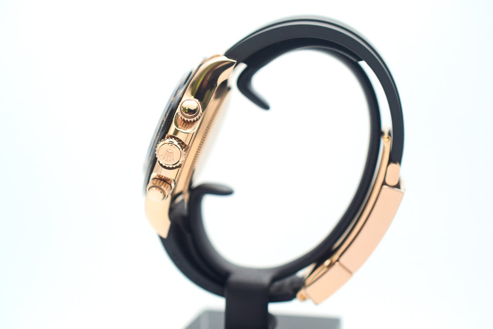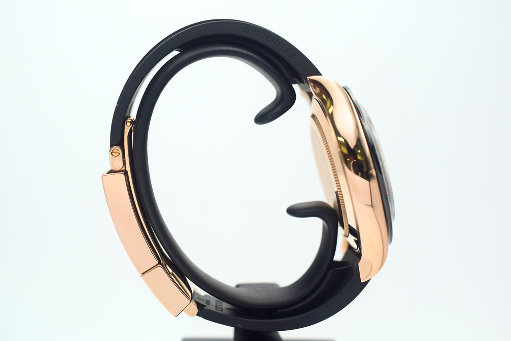 Case: 18K rose gold case 40.0 mm in diameter. Special screw-down crown and pushers. Rolex logo on the crown.