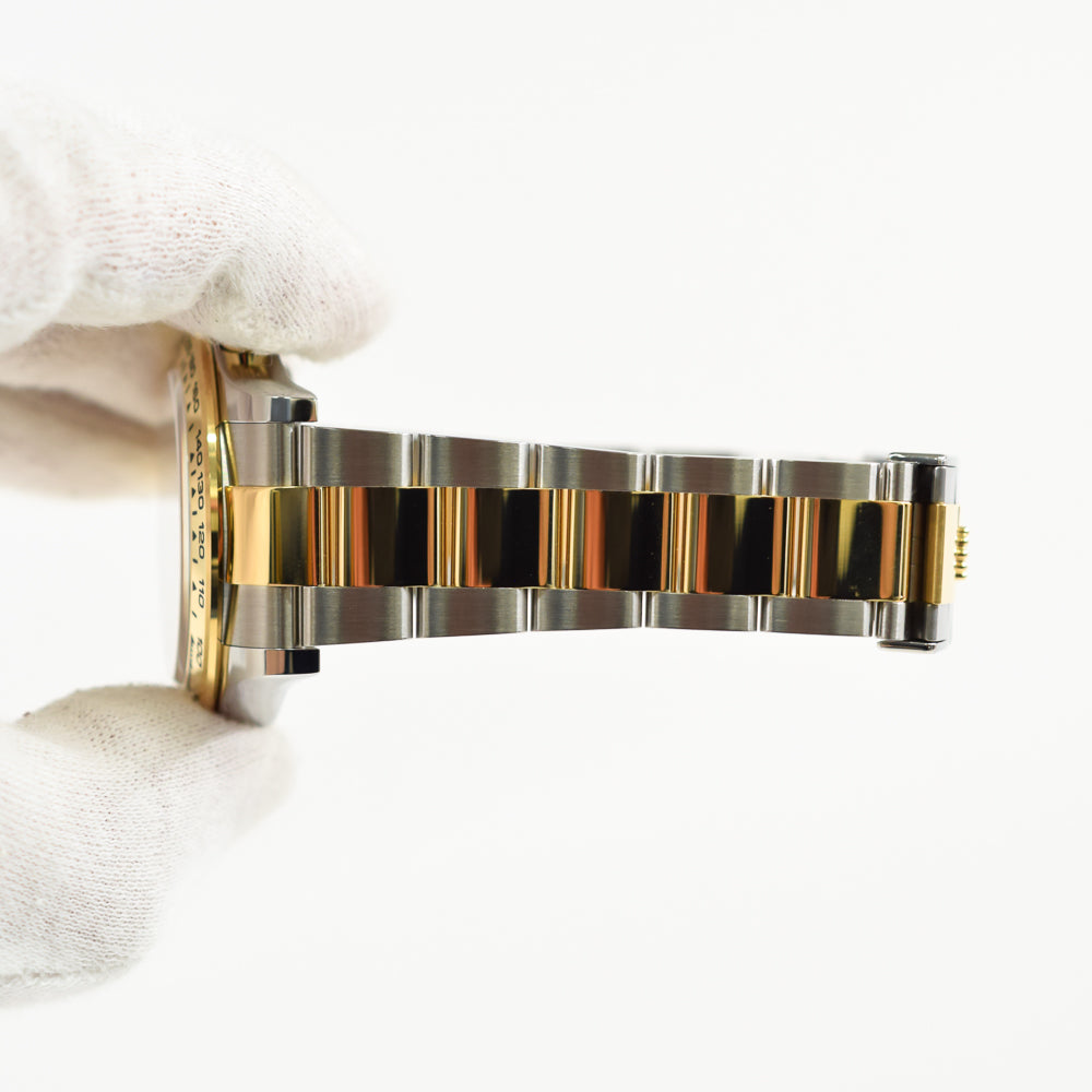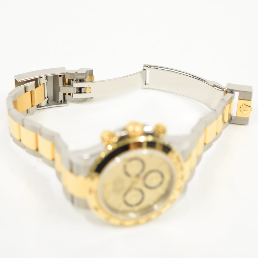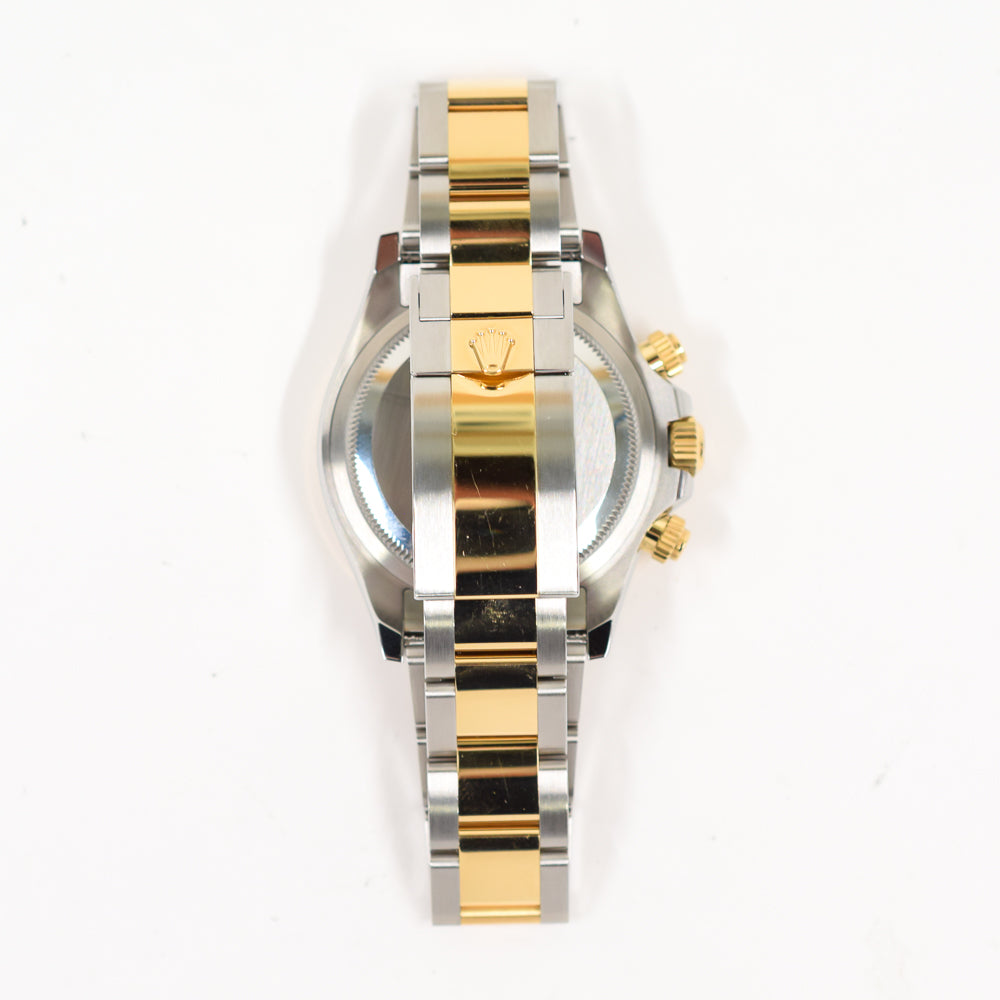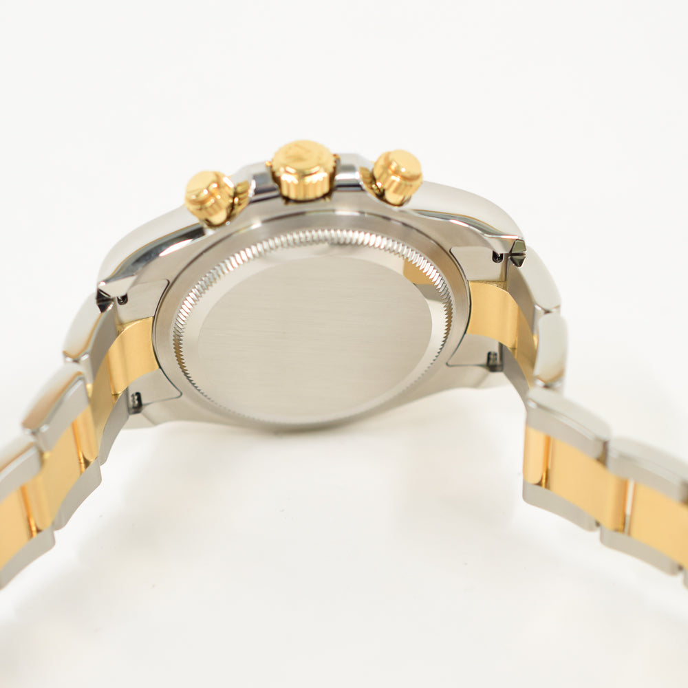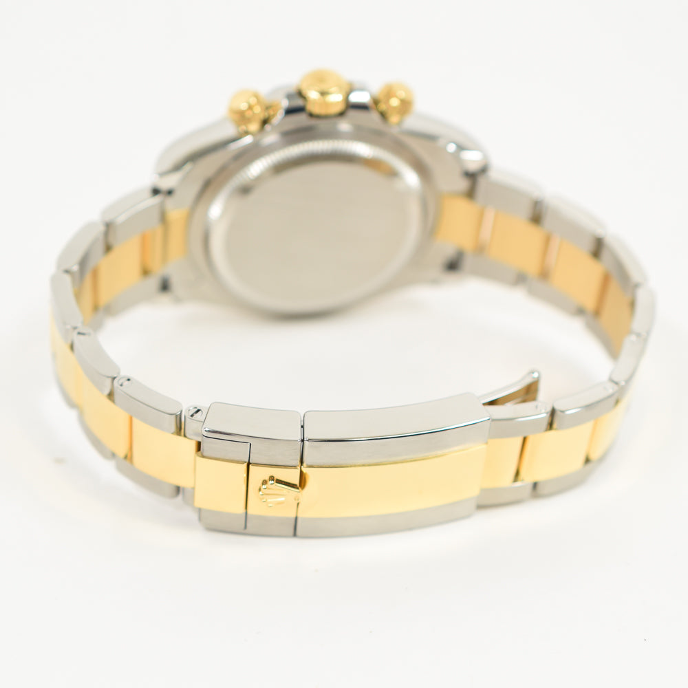 Case: Stainless steel and 18K yellow gold case 40.0 mm in diameter. Special screw-down push buttons. Triplock winding crown protected by the crown guards. Two 18k yellow gold pushers operate the chronograph functions. Rolex logo on the 18k yellow gold crown.