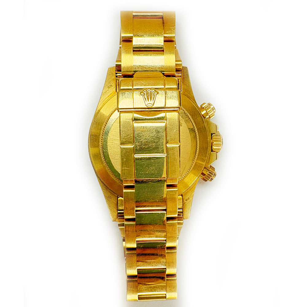 Rolex Daytona 16528 Mens Watch. 40mm 18K yellow gold case. 18K yellow gold tachymeter bezel. Black dial with luminous gold hands and factory diamond hour marker. Three black sub-dials. Small seconds hand at 9 o'clock. 30-minute counter at 3 o'clock. 12-hour counter at 6 o'clock. Minute maker on the outer dial. 18K yellow gold Oyster bracelet with fold over clasp with safety. Will fit up to 6.5-Inch wrist. Sapphire crystal. 18K yellow gold case back. Automatic self-winding movement.