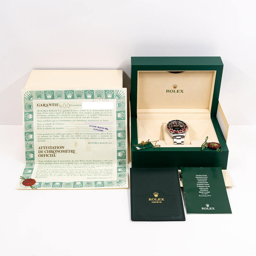 Silver-tone stainless steel case with a silver-tone stainless steel oyster bracelet. Bi-directional rotating stainless steel bezel. Black dial with silver-tone hands and index hour markers. Minute markers around the outer rim. Dial Type: Analog. Luminescent hands and markers. Date display at the 3 o'clock position. Rolex Calibre 3175 Automatic movement, containing 31 Jewels, bitting at 28800 vph, and has a power reserve of approximately 48 hours. Scratch resistant sapphire crystal. Screw down crown. Solid case back. Round case shape, case size: 40 mm. Fold over clasp with a safety release. Water resistant at 100 meters / 330 feet. Functions: date, GMT, second time zone, hour, minute, second. Gmt-master "pepsi" Series. Casual watch style. Watch label: Swiss Made.