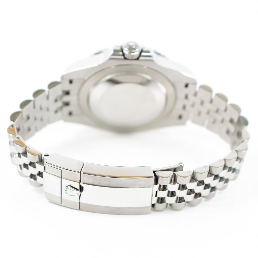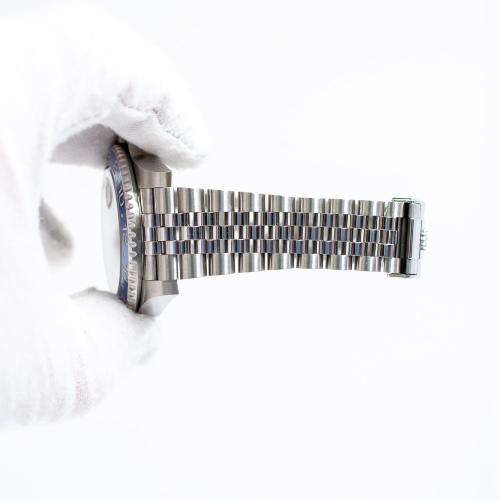 Stainless steel case with a stainless steel Rolex jubilee bracelet. Bi-directional rotating stainless steel bezel with a black and blue (Batman) ring showing 24 hour markers. Black dial with luminous silver-tone hands and dot hour markers. Minute markers around the outer rim. Dial Type: Analog. Luminescent hands and markers. Date display at the 3 o'clock position. Rolex calibre 3285 automatic movement with a 70-hour power reserve. Scratch resistant sapphire crystal. Screw down crown. Solid case back. Round case shape. Case size: 40 mm. Folding oysterlock clasp. Water resistant at 100 meters / 330 feet. Functions: date, hour, minute, second, 24 hours, GMT. Luxury watch style. Watch label: Swiss Made.