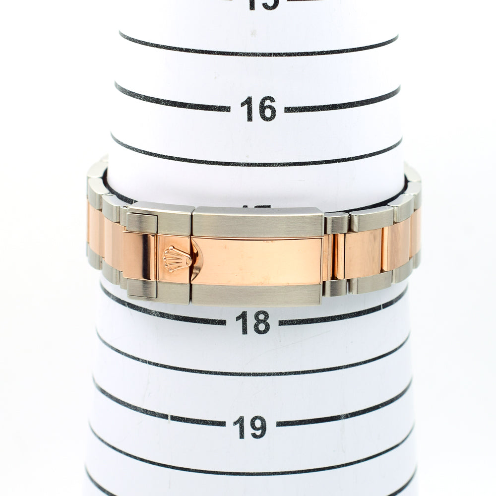 40mm Everose Rolesor case with Oystersteel monobloc middle case, screw-down Everose gold crown, Everose gold bidirectional rotatable 24-hour graduated bezel with brown and black Cerachrom insert and engraved numerals, scratch-resistant sapphire crystal with cyclops lens over the date, black dial, hour markers set with Chromalight, Rolex calibre 3285 self-winding movement with second time-zone hour hand and instantaneous date, approximately 70 hours of power reserve, Everose Rolesor Oyster bracelet with flat three-piece links, folding Oysterclasp buckle with Easylink 5mm comfort extension link. Waterproof to 100 meters.