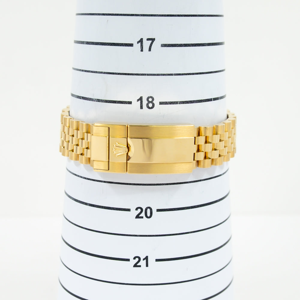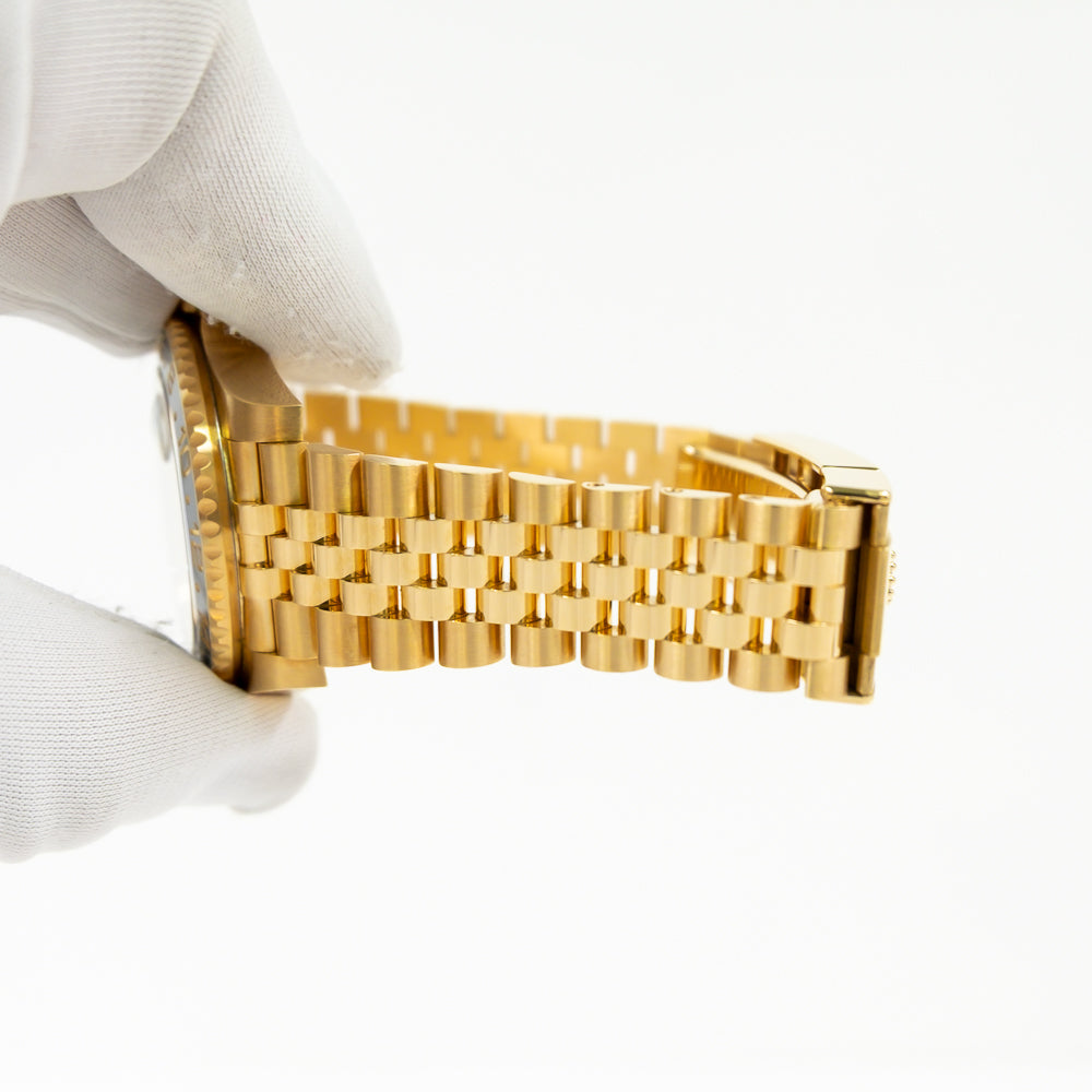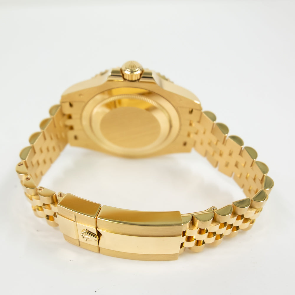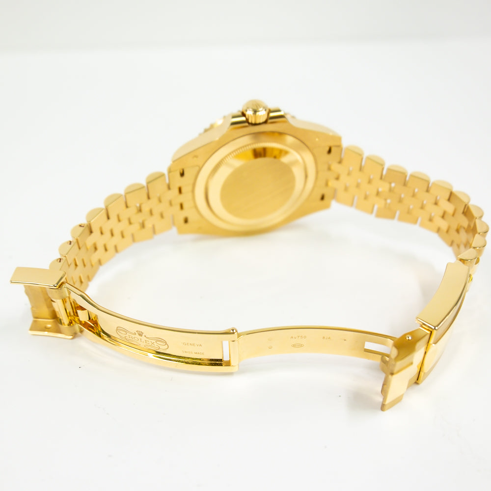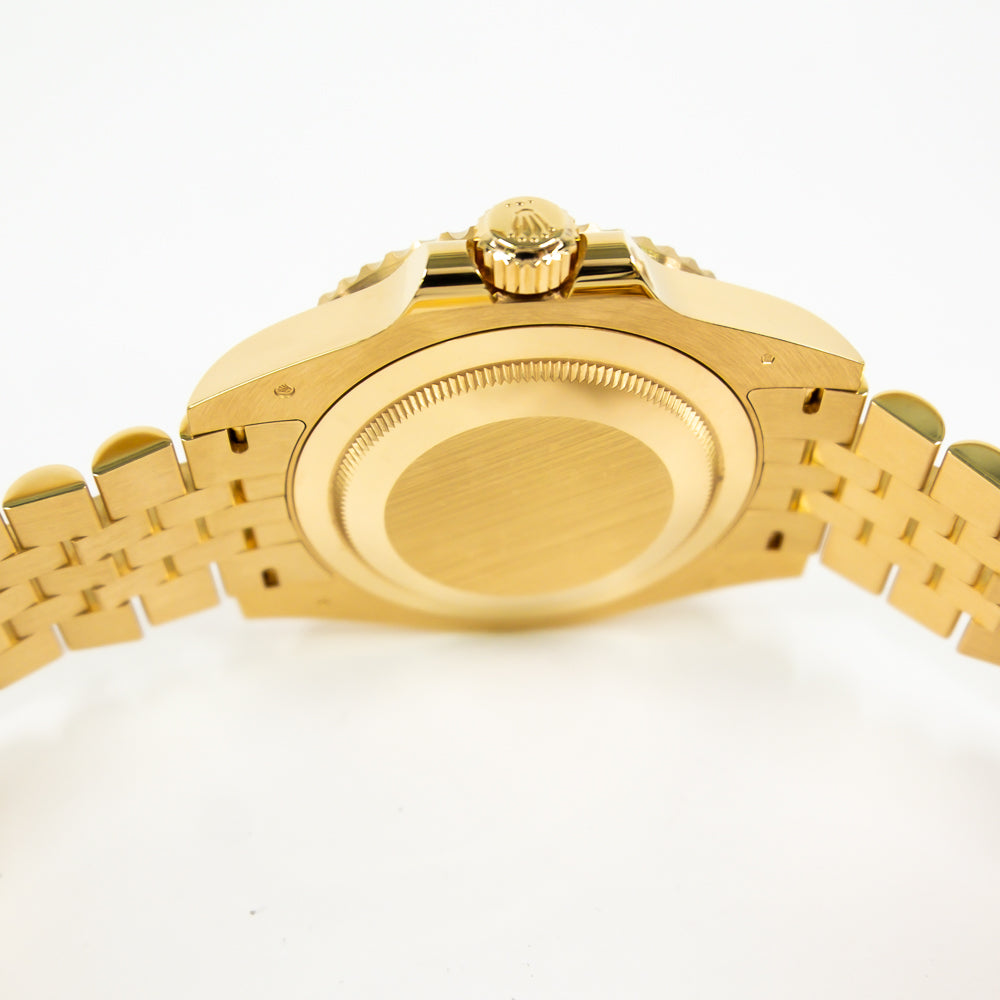 Yellow gold-tone 18kt yellow gold case with a yellow gold-tone 18kt yellow gold jubilee bracelet. Bi-directional rotating grey and black cerachrom bezel. Black dial with yellow gold-tone hands and index hour markers. Minute markers around the outer rim. Dial Type: Analog. Luminescent hands and markers. Date display at the 3 o'clock position. Rolex Calibre 3285 Automatic movement, based upon Rolex 3255, containing 31 Jewels, bitting at 28800 vph, and has a power reserve of approximately 70 hours. Scratch resistant sapphire crystal. Screw down crown. Solid case back. Round case shape, case size: 40 mm. Fold over clasp with a safety release. Water resistant at 100 meters / 330 feet. Functions: date, GMT, second time zone, hour, minute, second, chronometer. Gmt-master II Series. Luxury watch style. Watch label: Swiss Made.