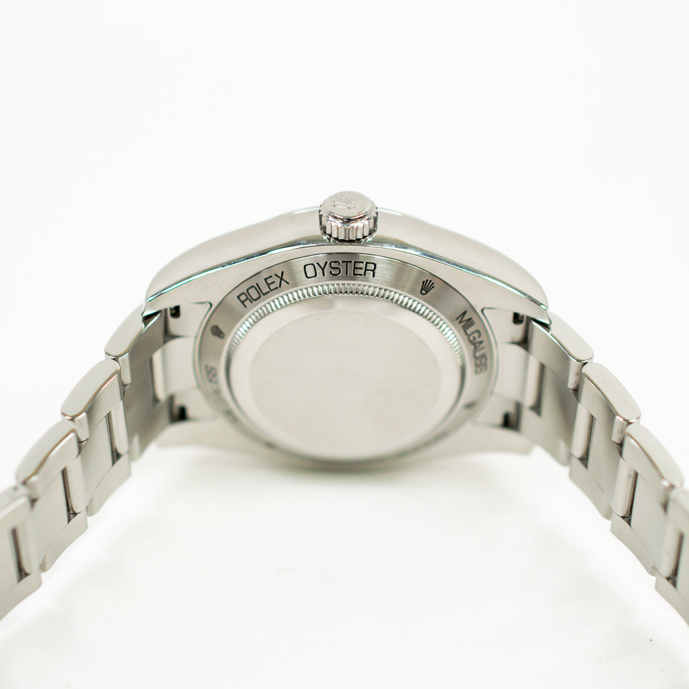 Rolex Milgauss Oystersteel Men's watch model 116400GV. Features a polished 904L stainless steel case with a screw-down crown & case back and a brushed with polished 904L stainless steel oyster bracelet. A deep black dial is accentuated by Chromalight luminescent hands, index hour markers, and orange hour markers at the 3, 6, & 9 positions all beneath a scratch-resistant green sapphire crystal, encompassed by a polished stainless steel smooth bezel. This daring watch is driven by COSC Certified Self-winding movement and a 48-hour power reserve. Even with an anti-magnetic feature, you will still be drawn to this watch.