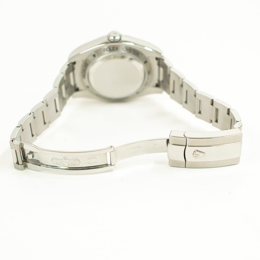 Stainless steel case with a stainless steel Rolex oyster bracelet. Fixed stainless steel bezel. Blue dial with luminous silver-tone hands and index hour markers. Arabic numeral minute markers (at 5 minute intervals). Minute markers around the outer rim. Dial Type: Analog. Luminescent hands and markers. Automatic movement with a 48-hour power reserve. Scratch resistant sapphire crystal. Screw down crown. Solid case back. Case diameter: 40 mm. Case thickness: 13 mm. Round case shape. Band width: 15 mm / 20 mm. Band length: 7.5 inches. Oysterlock clasp. Water resistant at 100 meters / 330 feet. Functions: hour, minute, second. Luxury watch style. Watch label: Swiss Made.