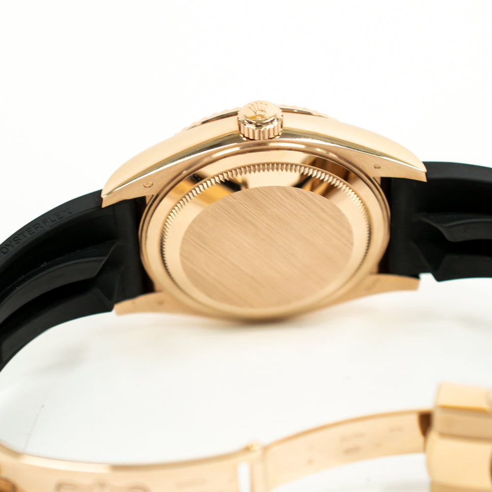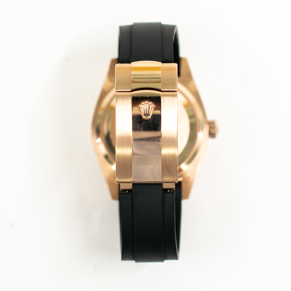 18kt rose gold case with a black rubber strap. Bi-directional rotating ring command rose gold-tone 18kt rose gold bezel. Chocolate dial with rose gold-tone hands and index hour markers. Minute markers around the outer rim. Dial Type: Analog. Luminescent hands and markers. Date display at the 3 o'clock position. One subdial displaying: 24 hour. Rolex Calibre 9002 automatic movement with a 72-hour power reserve. Scratch resistant sapphire crystal. Screw down crown. Solid case back. Round case shape, case size: 42 mm. Fold over clasp with a safety release. Water resistant at 100 meters / 330 feet. Functions: annual calendar, month, date, GMT, second time zone, hour, minute, second, chronometer. Sky-dweller Series. Luxury watch style. Watch label: Swiss Made.