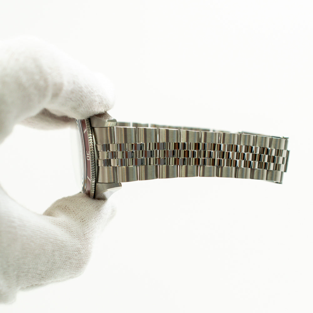 Silver-tone stainless steel case with a silver-tone 5-link stainless steel bracelet. Uni-directional rotating burgundy stainless steel bezel. Red dial with silver-tone hands and index hour markers. Minute markers around the outer rim. Dial Type: Analog. Luminescent hands and markers. Tudor Calibre MT5400-U automatic movement with a 65-hour power reserve. Scratch resistant sapphire crystal. Screw down crown. Round case shape, case size: 39 mm, case thickness: 11.7 mm. Band width: 20 mm. Water resistant at 200 meters / 660 feet. Functions: chronometer, hour, minute, second. Black Bay 58 Series. Watch label: Swiss Made.