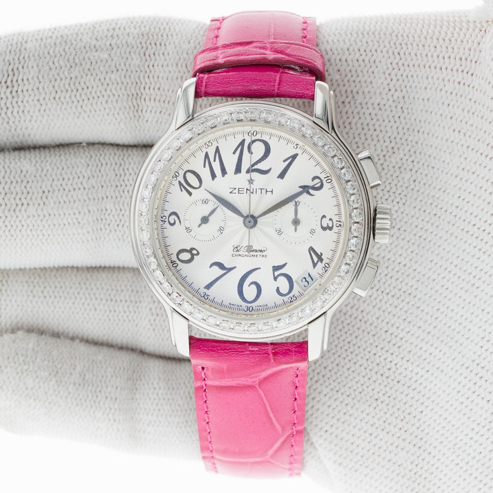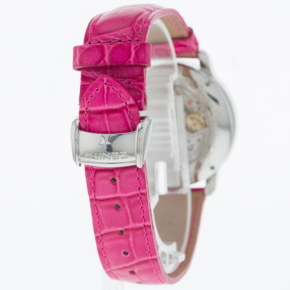 Zenith Chronomaster Star El Primero Unisex Watch Model 03.1230.4002/01.C508. Polished Stainless Steel case with Pink Lizard Leather strap. Deployment Buckle clasp. Dial description: Silver Guilloche Chronograph with Date Between 4 and 5 dial. Silver dial. El Primero COSC Automatic Self Winding movement. Scratch Resistant Sapphire crystal. Case size: 37mm. Case thickness: 14mm. 30 Meters - 100 Feet water resistant.